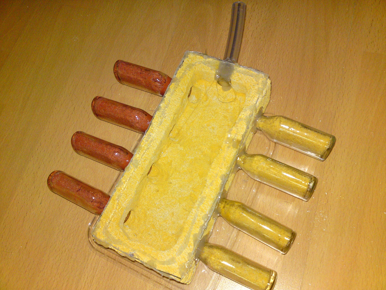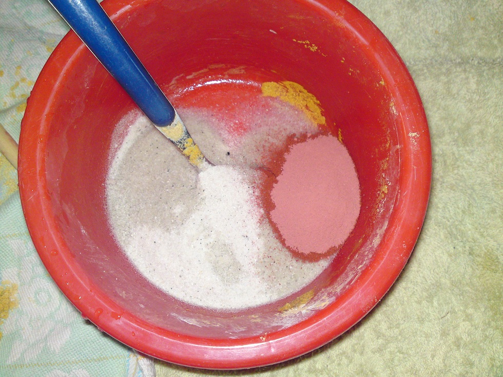 Den Sand habe ich auch mit Lehm eingefärbt. Hierbei kann man sehen wie viel Sand ich zu dem Sand-Lehmgemisch dazuführe um es für die Ameisen schön grabfähig zu machen. Mehr als fünfmal so viel Sand wie das Gemisch, den reinen Lehm kann man wirklich nicht als Nestmaterial nutzen.