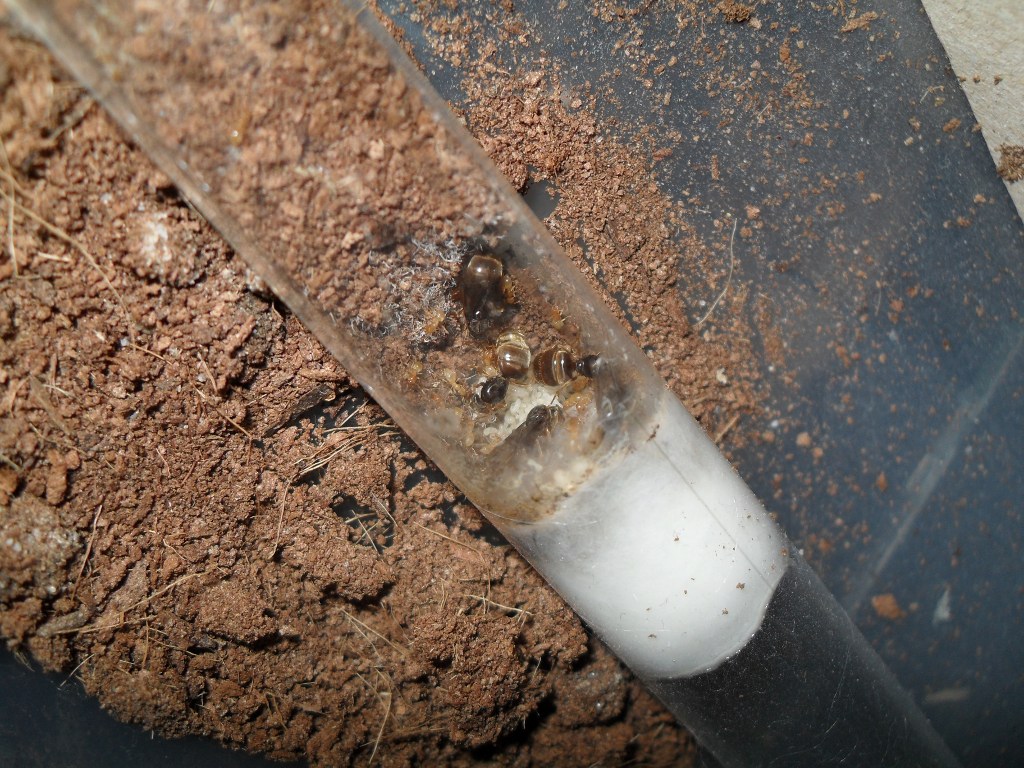 Nun sind die kleinen groß geworden waren. eine beachtliche Anzahl haben sie geschafft. Dürften es soch weit mehr als 20 Arbeiterinnen sein. Leider ist es mir nicht möglich die Tiere zu schätzen geschweige denn zu zählen. Es ist immer Brut in allen Stadien vorhanden. Unermüdlich werden Larven groß gezogen.