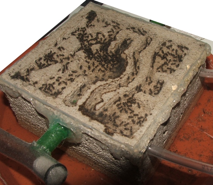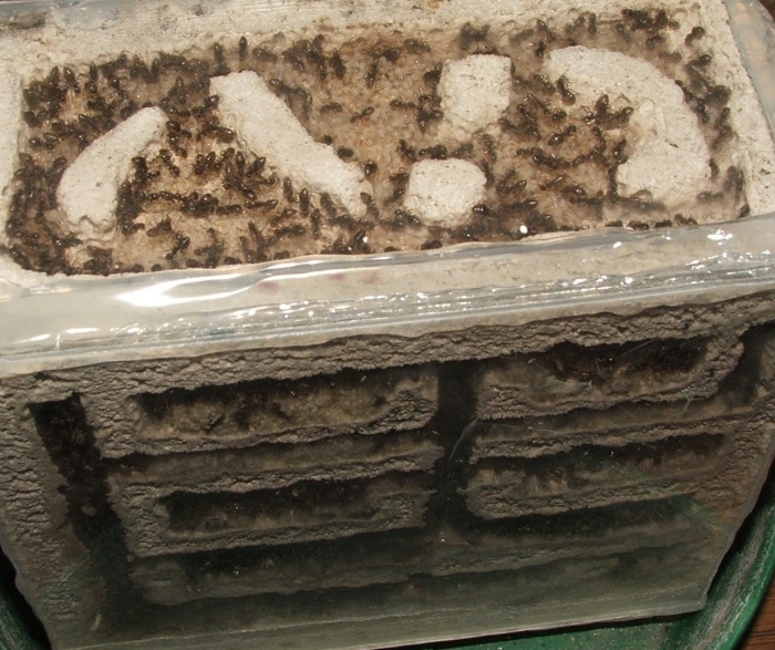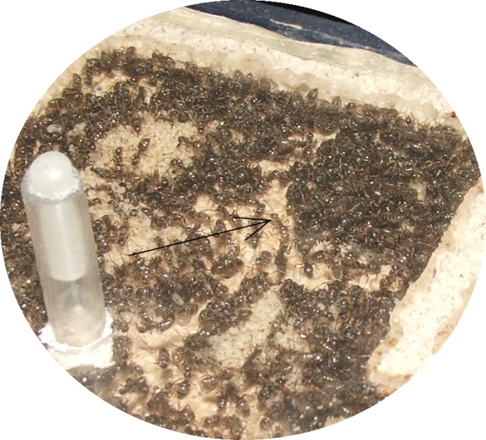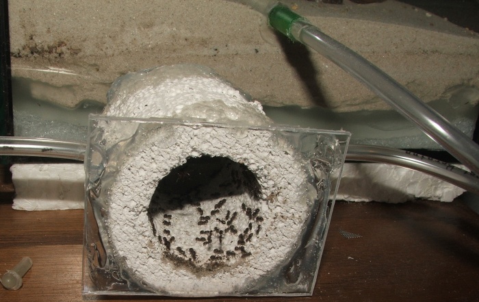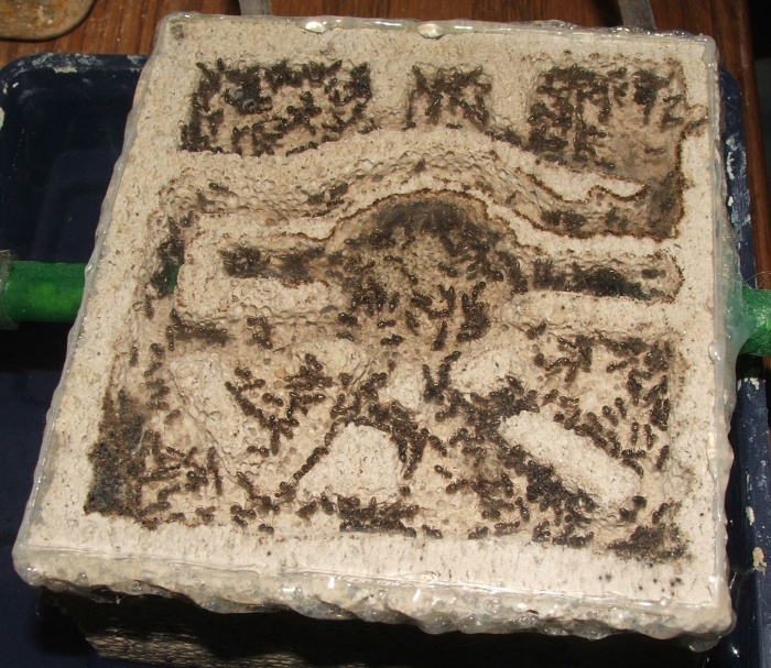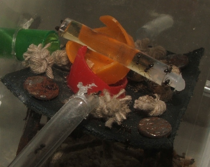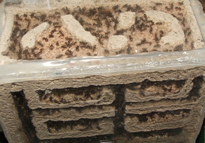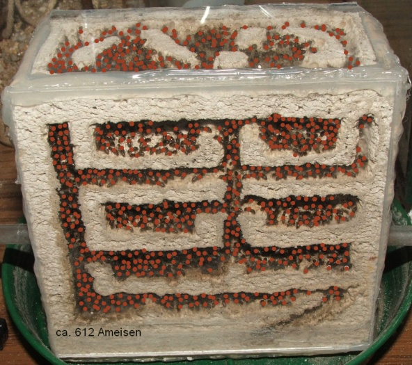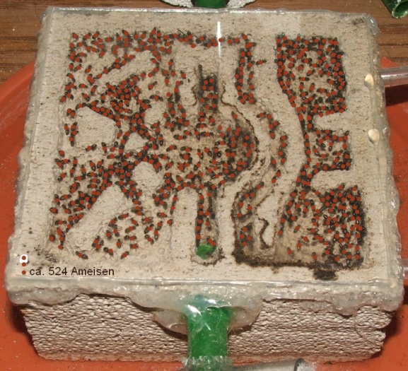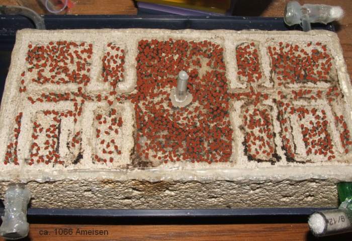 Weitere Änderungen waren, dass sie statt einer Insel in eine Anlage mit externen Nestern und abgeschlossenen Arenen kamen, wodurch die Sterblichkeit durch Ersaufen deutlich abnahm, außerdem stieg ich von der Fütterung mit Zuckerwasser und Fliegen immer mehr auf die Fütterung mit Honigwasser und Grillen/Spinnen/Mehlwürmern etc. um, langer Rede kurzer Sinn: die Vermehrung stieg immer weiter und immer mehr Adoptivtöchter wurden durch Arbeiterinnen der eigentlichen Königin ersetzt und mittlerweile dürfte man die Kolonie nicht mehr als gepusht bezeichnen - ist auch besser so.