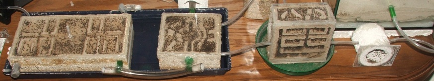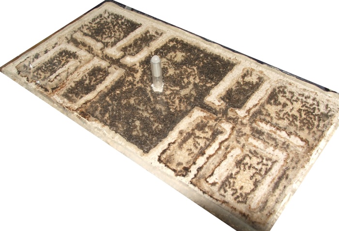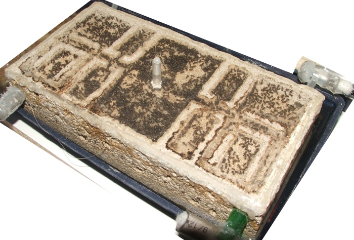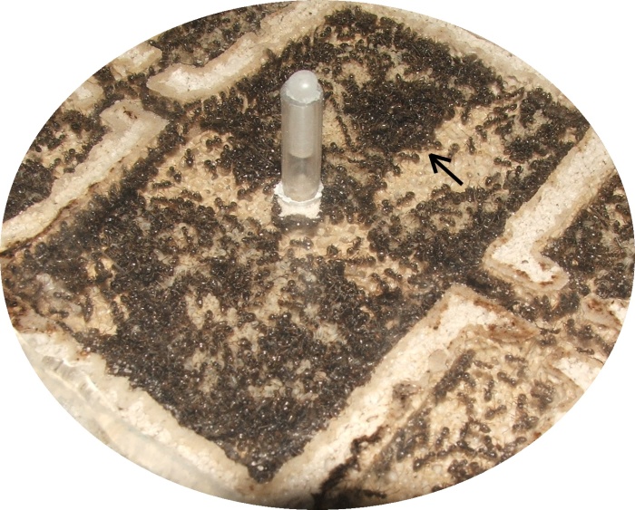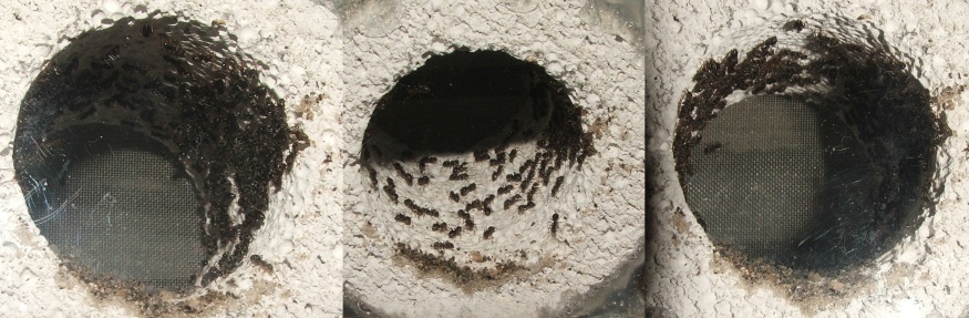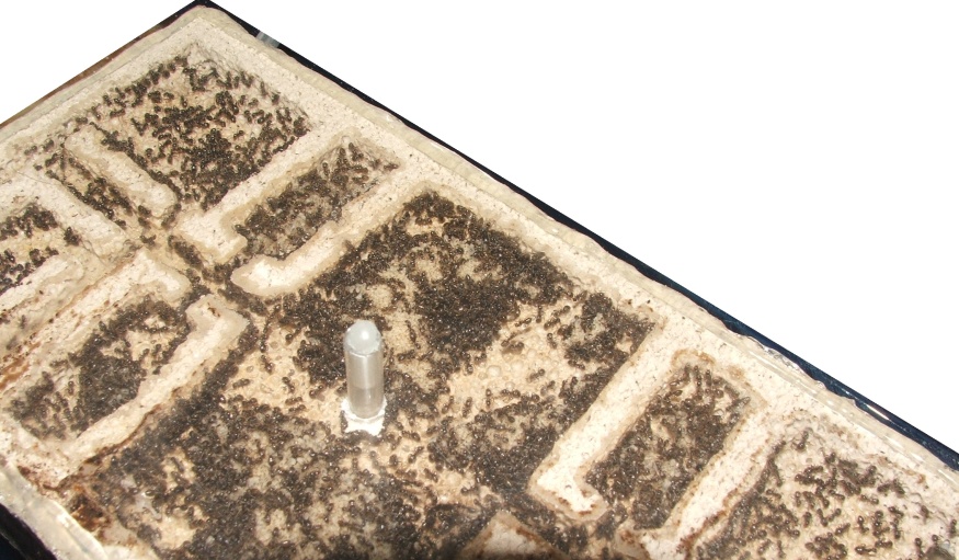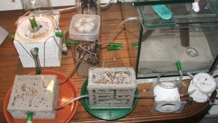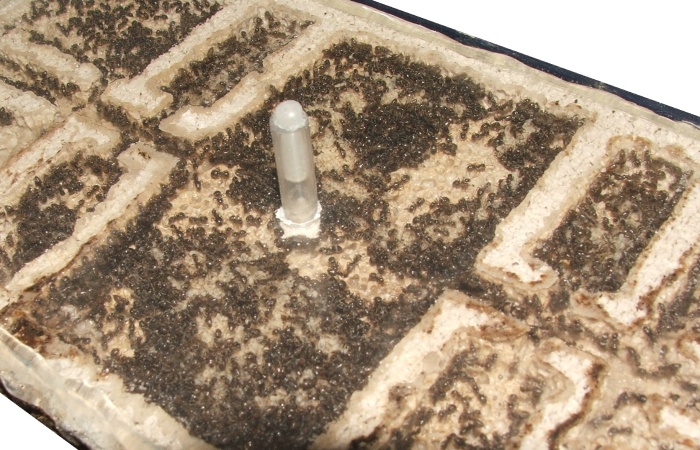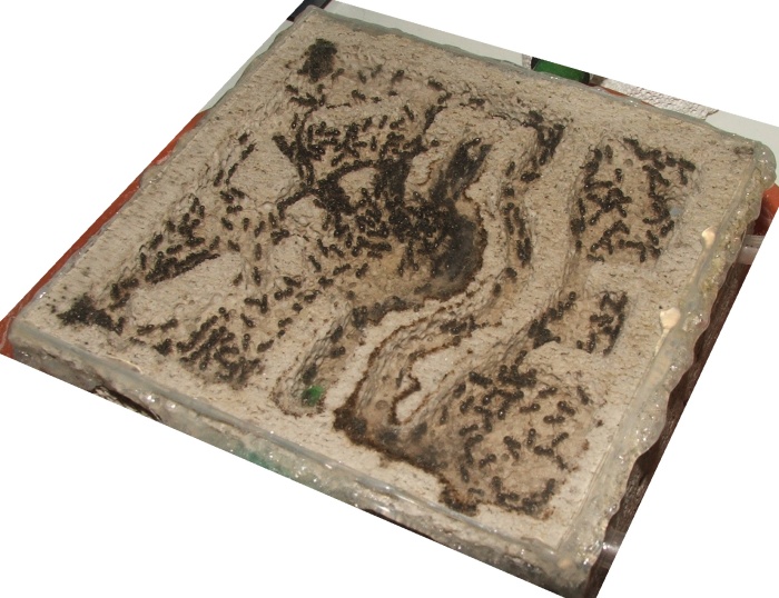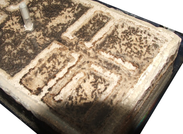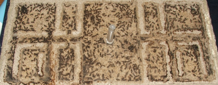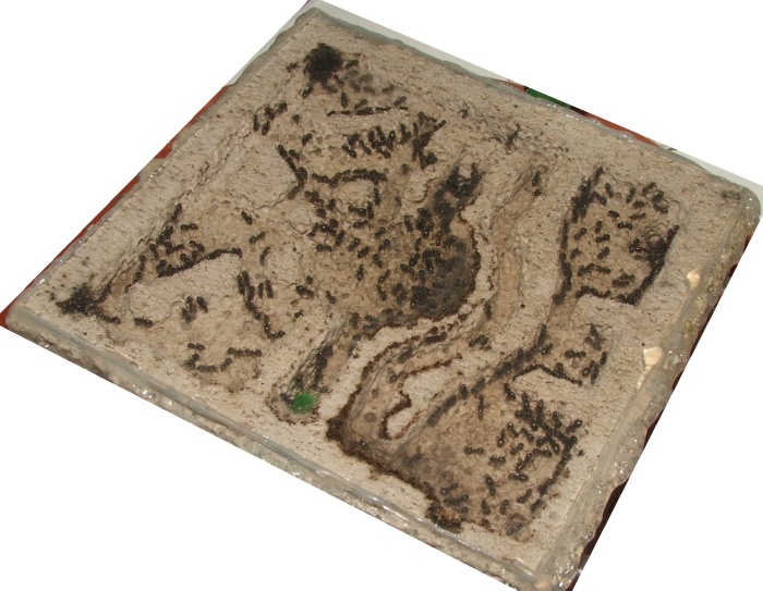 Weitere Änderungen waren, dass sie statt einer Insel in eine Anlage mit externen Nestern und abgeschlossenen Arenen kamen, wodurch die Sterblichkeit durch Ersaufen deutlich abnahm, außerdem stieg ich von der Fütterung mit Zuckerwasser und Fliegen immer mehr auf die Fütterung mit Honigwasser und Grillen/Spinnen/Mehlwürmern etc. um, langer Rede kurzer Sinn: die Vermehrung stieg immer weiter und immer mehr Adoptivtöchter wurden durch Arbeiterinnen der eigentlichen Königin ersetzt und mittlerweile dürfte man die Kolonie nicht mehr als gepusht bezeichnen - ist auch besser so.