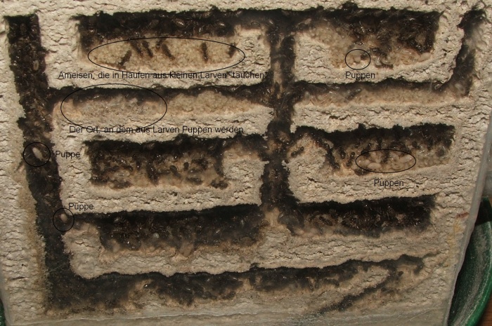 Kaum gefangen habe ich die Kolonie schnell gepusht, mit einigen hundert Puppen, wolle schnell viel haben und es hat auch geklappt, dennoch hat die Königin natürlich mit einer arbeiterinnenunterstützten claustralen Gründung begonnen, wenige Pygmäen aufgezogen und auch sonst nicht mehr Eier gelegt, als andere Königinnen - eher sogar weniger als andere wirklich claustrale Gründerinnen.