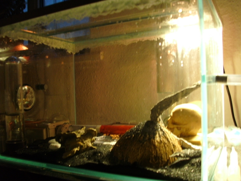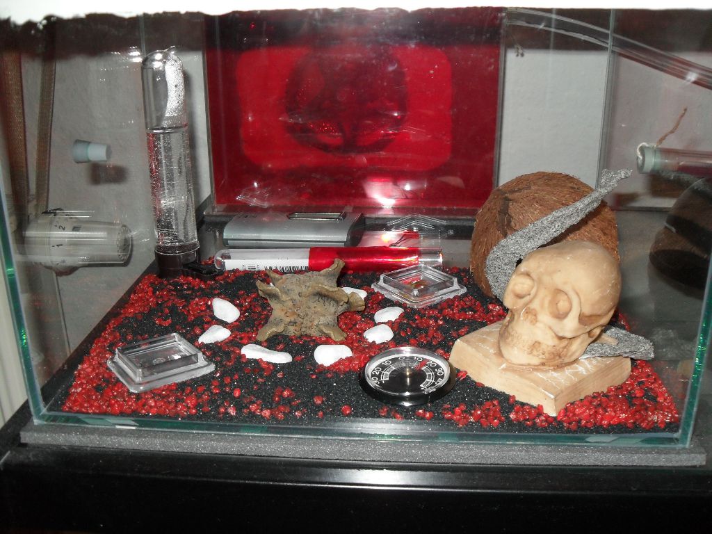 Das Dekozimmer war als Wasserspendender RG gedacht und ist darum von mir auch nicht abgedunkelt worden. Das RG liegt quasi direkt unterm Wärmespot und ziemlich weit weg vom eigentlichem RG auf der kleinen Plexiglasplattform die ich gebaut habe.