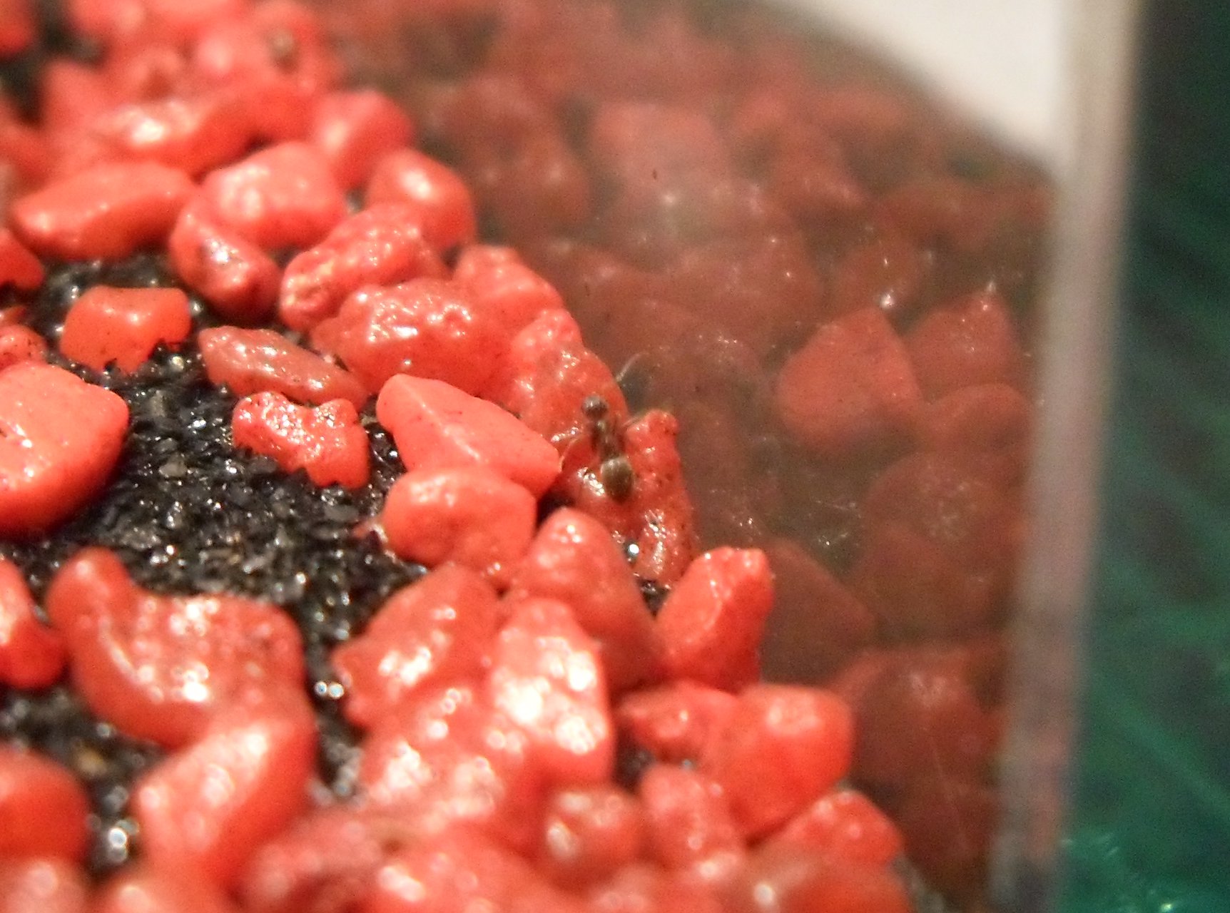 Meine Ameisen, die noch immer in Ihrem abgedunkeltem RG hausen und welches sie aus eigener Kraft befeuchten und mittlerweile mit Sand bis unter die Decke zugebaut haben, dient nun nicht länger als primäre Kinderstube. (Wohl gemerkt: die Einstreu besteht aus Sand und Gefärbtem Kies. Die Sandkörner sind nicht mal einen Millimeter groß. Darum hat das zuschaufeln die Ameisen auch einiges an Zeit gekostet.)