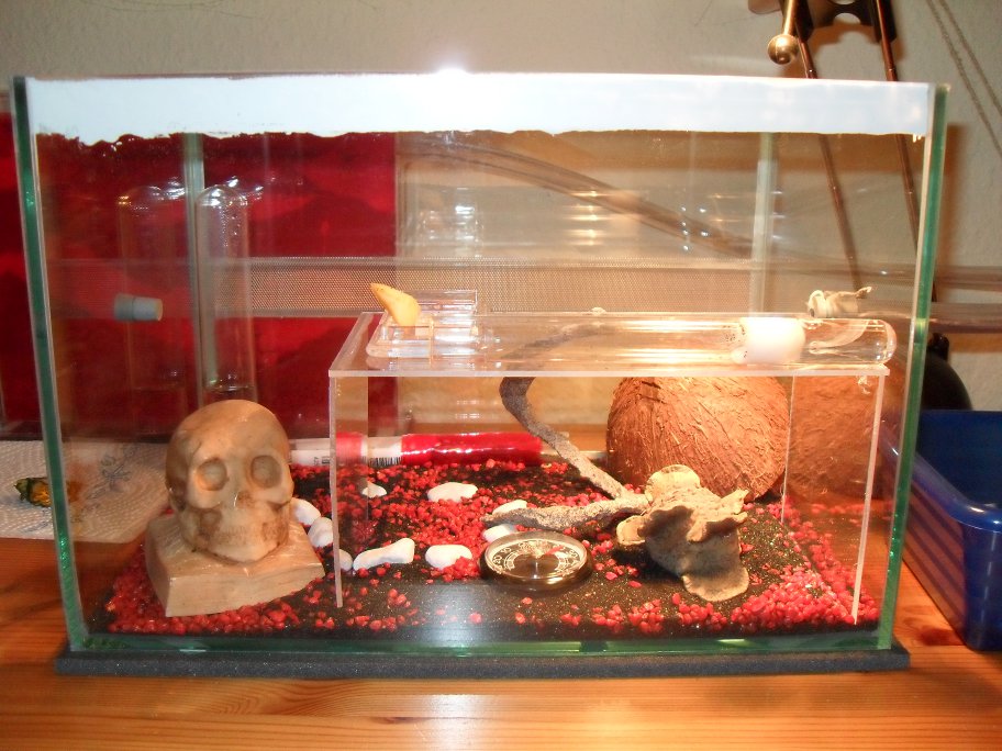 In den Tagen habe ich noch eine kleine Halogenlampe mit Zeitschaltuhr angebracht. Diese bescheint einen kleinen Ton-Totenkopf. Viel Anklang findet diese Besonnung aber noch nicht. :roll: