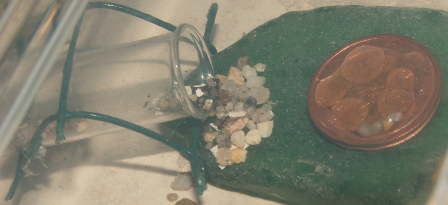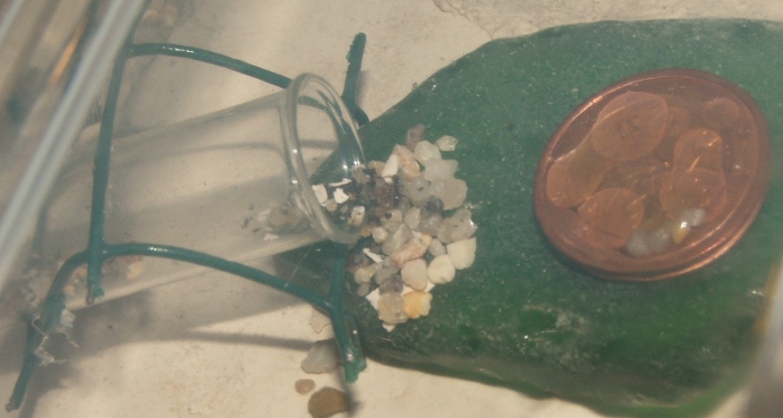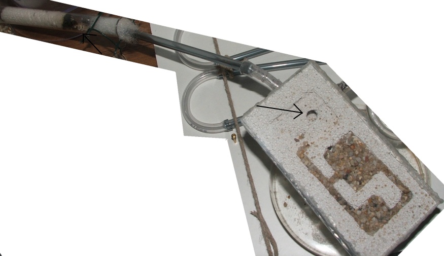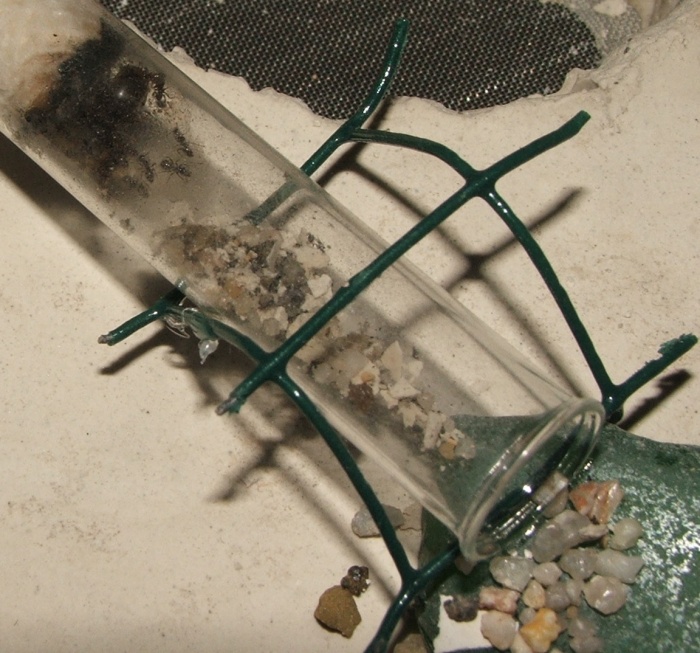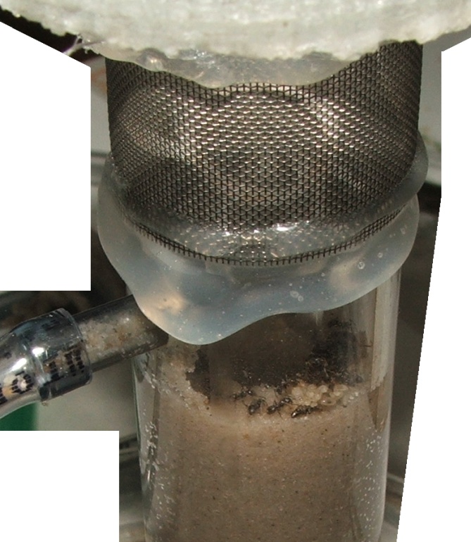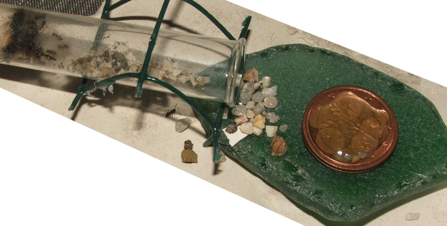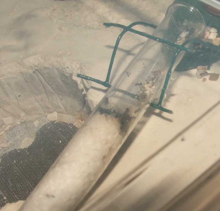 dabei ist noch ein Bilde, auf dem eine Arbeiterin ein Sandkörnchen schleppt, sie sind gerade schwer damit beschäftigt, den Eingang zuzupacken, man denkt zwar, dass sie da bald selbst nicht mehr durchpassen, aber noch klappt es, auf dem Bild davor kann man ja sehen, dass das Nest selbst schon eine Rampe aus Sandkörnchen enthält, im Schlauch sind auch einige Körnchen wie zum Hürdenlauf platziert...
