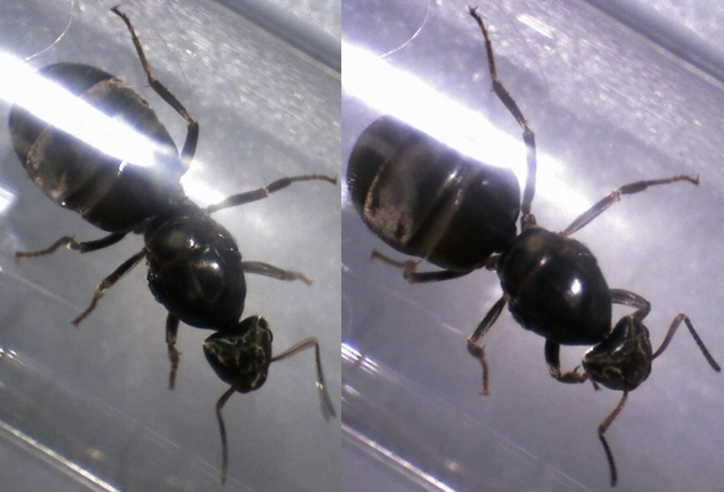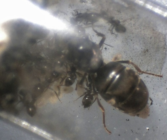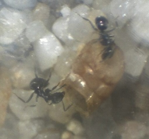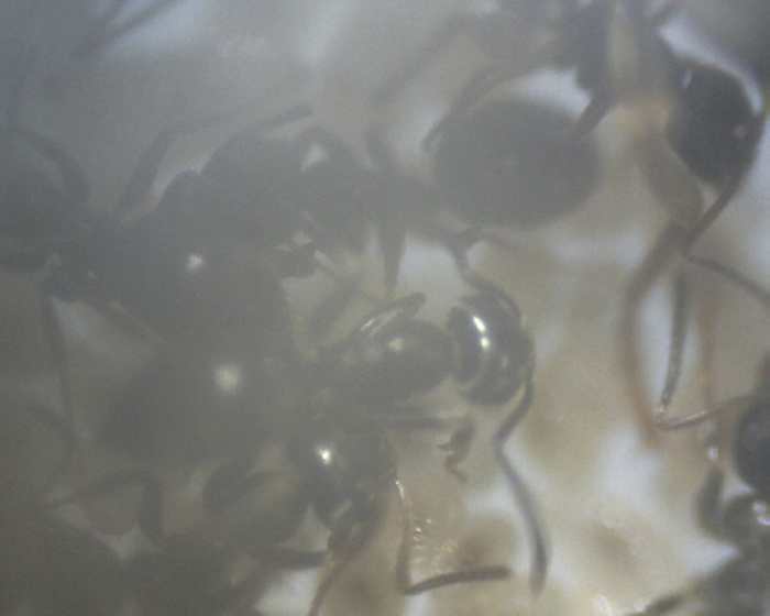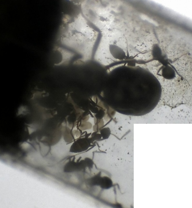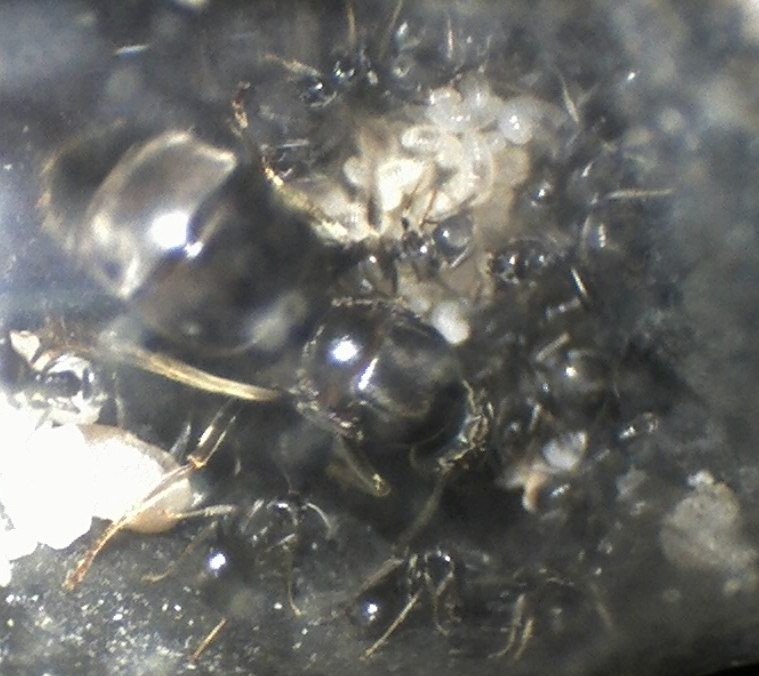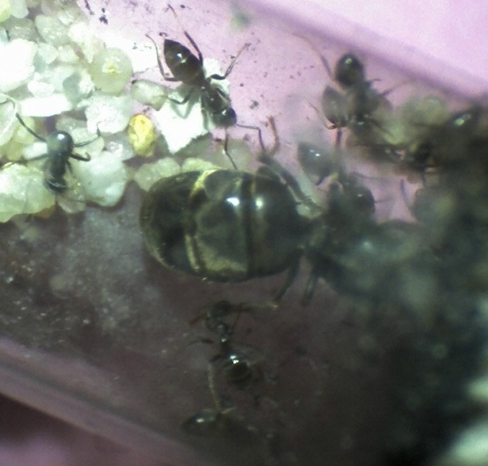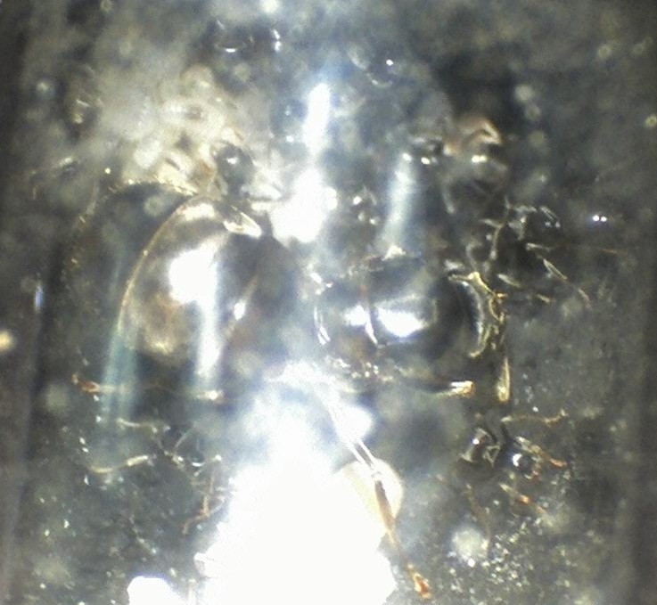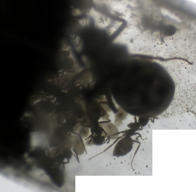 Ich habe gerade ein paar Bilder vom alten Nestinneren gemacht - und nein, ich weiß nicht, wieso der Gaster der Königin so deformiert erscheint, mit dem Bloßen Auge kann man das jedenfalls nicht erkennen, ich vermute einfach mal, dass es damit zusammenhängt, dass sie ihre Fettreserven aufgebraucht hat...