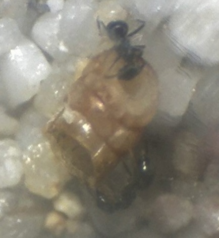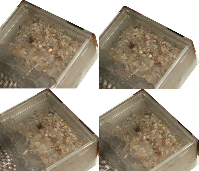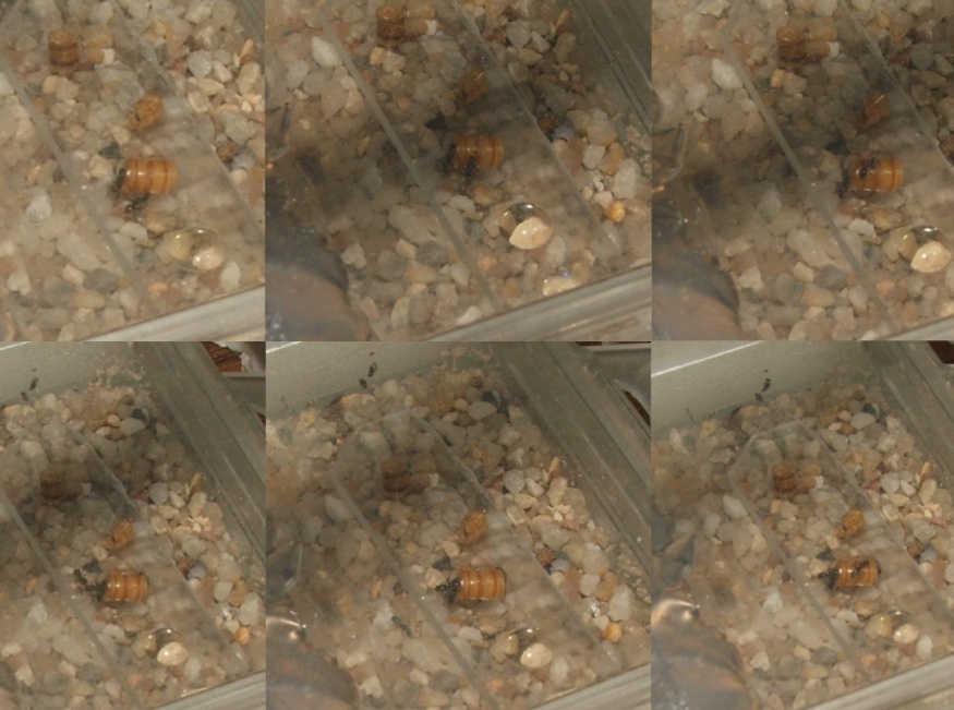 Auf jeden Fall war schon ein gewisser Hunger da, zunächst ganz obligatorisch entdeckte eine Arbeiterin (das kann lange dauern, jenachdem wie fleißig sie gerade fouragieren) das Mehlwurmstück, fraß sich eine Probe an und lief damit zurück zum Nest, Nestgenossinnen folgten der Spur, zunächst wieder einzeln, dann immer mehr, momentan sind drei bis vier Tiere damit beschäftigt, Proteine aufzunehmen (das frisch gegebene Honigwasser wird erst einmal ignoriert), habe euch da mal eine Bilderreihe zusammengeschnippelt: