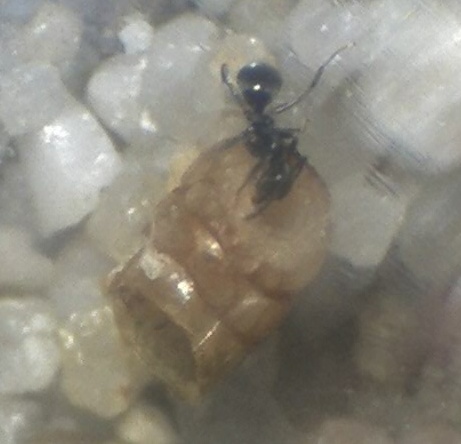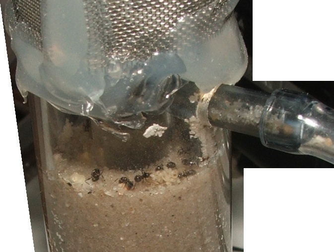Die Ameisen sind gerade fleißig dabei, das RG mit Sandkörnchen aus der Arena vollzustopfen, den frisch angebotenen Honig haben sie ab und zu mal aufgenommen...
