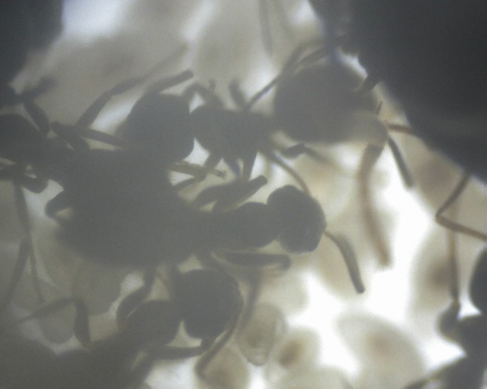 Mittlerweile haben sie sich gefunden, eine Arbeiterin spielt den Botenjungen und trägt die Brut zu der Königin, während sich in der Arena noch eine Kolonne bei der restlichen Brut gebildet hat - welcher mit abnehmender Brut jedoch schwindet...