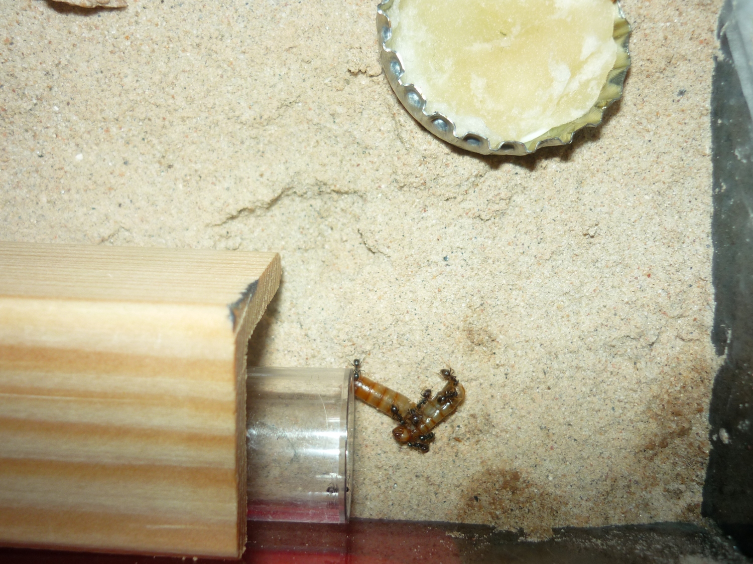 es geht voran. Ich habe einiges an Larven und die erste Puppe entdeckt. Juhuuu! Gerade mühen sie sich an ihrem Mehlwurm ab, kurz nach dem Reinwerfen waren schon um die zehn Arbeiterinnen draußen und seitdem versuchen sie ihn in ihr Rg-Nest zu schleppen.