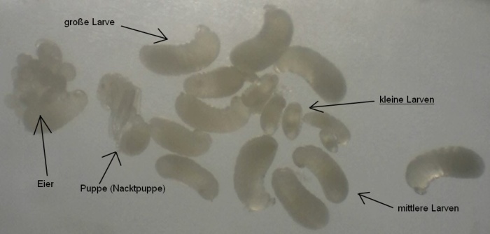 3. es gibt gerade am Anfang, das kann man ja auf dem Bild sehen, einige größere Larven, die in etwa gleich weit entwickelt sind und rasch nacheinander zu Puppen werden, sowie mittlere und kleine Larven, und irgendwie immer Eier (wobei man bei drei Königinnen wohl noch nicht von Haltungserfahrung reden kann), für kondinuierlichen Nachwuchs zu sorgen, scheint eine ihrer Überlebensstrategien zu sein,