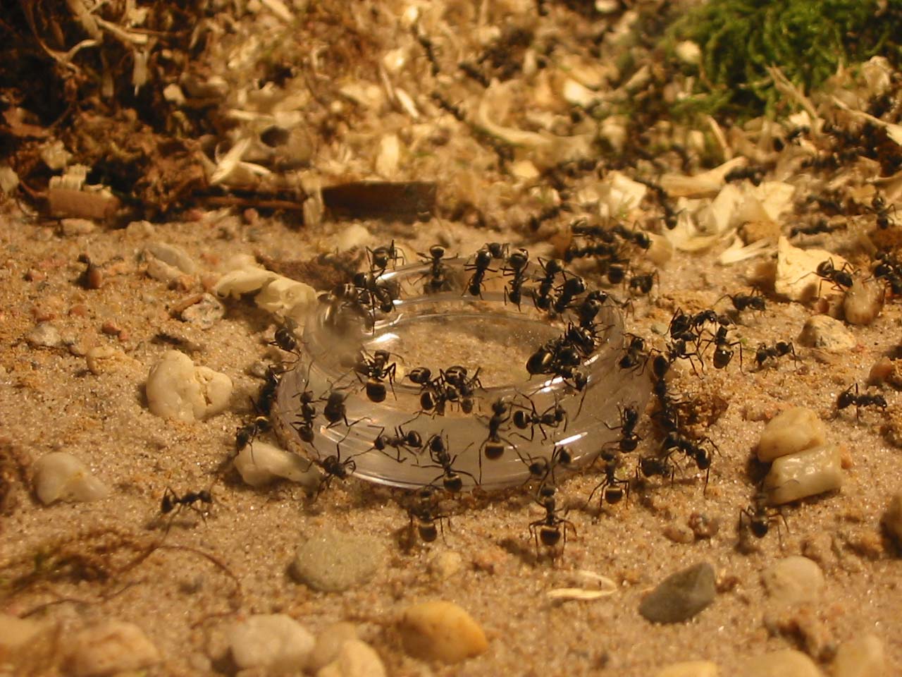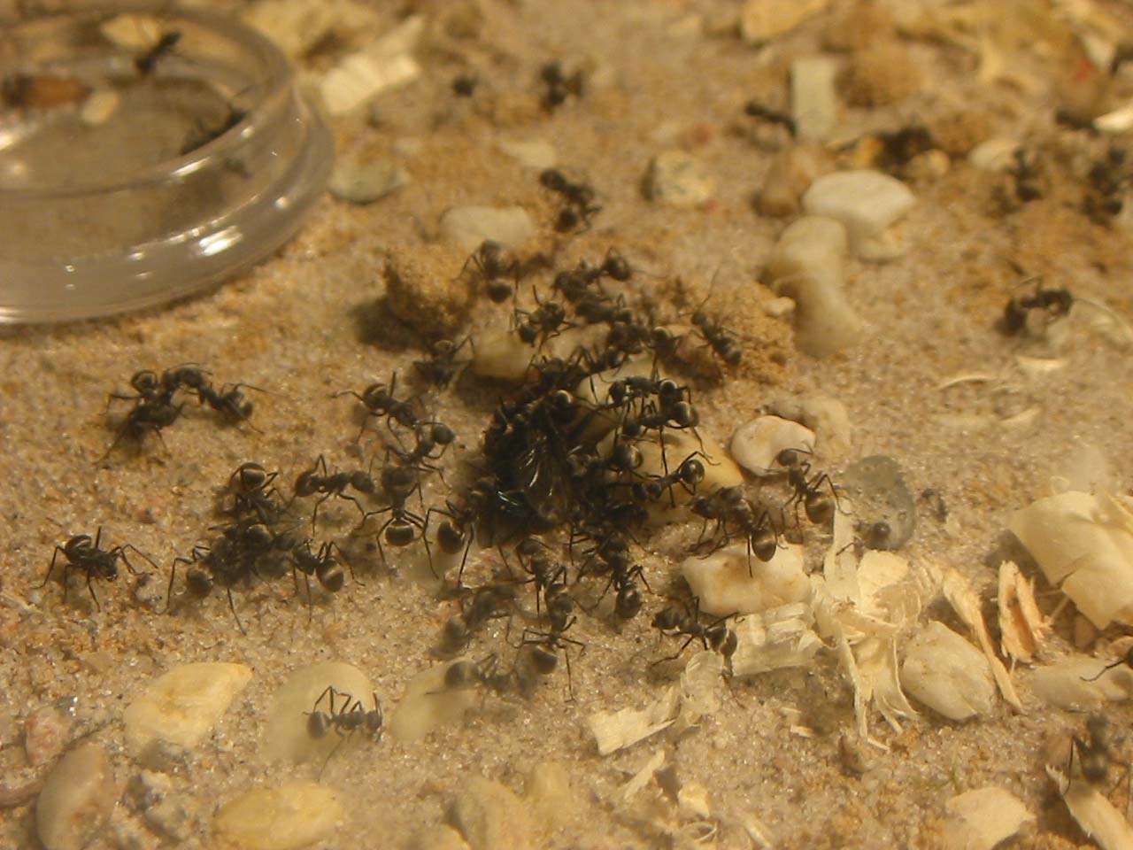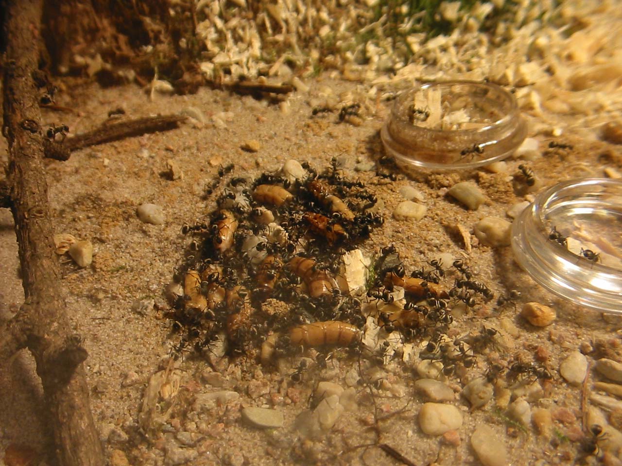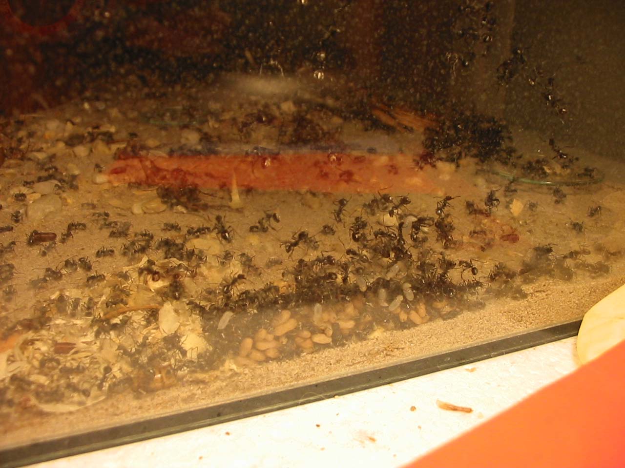 Es ist eine große Kolonie mit vielen hundert Arbeiterinnen und mindestens 9 Königinnen. Sie fressen wirklich sehr viel und vor allem proteinhaltiges ist immer gern gesehen. Honig-Zuckerwasser sowie eine Wassertränke stehen stets bereit.