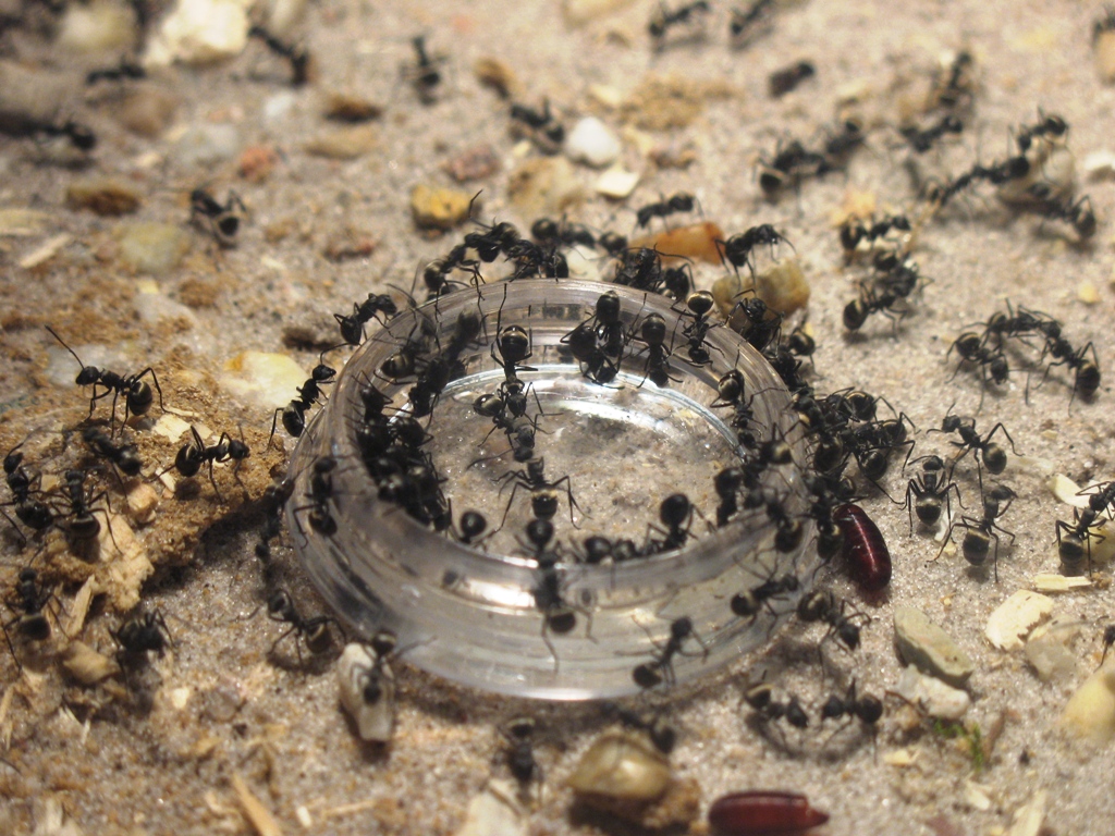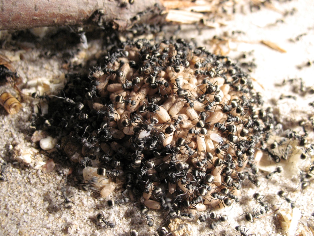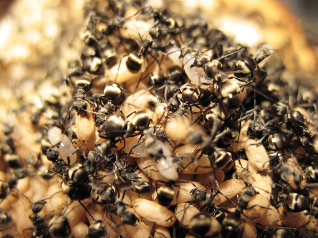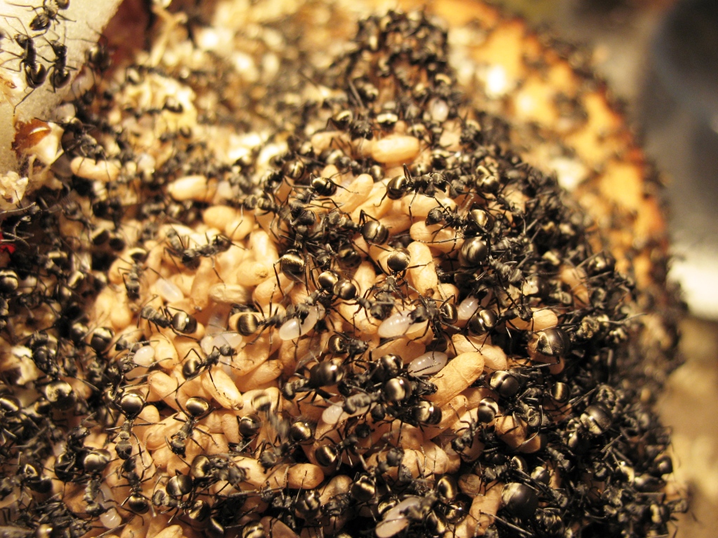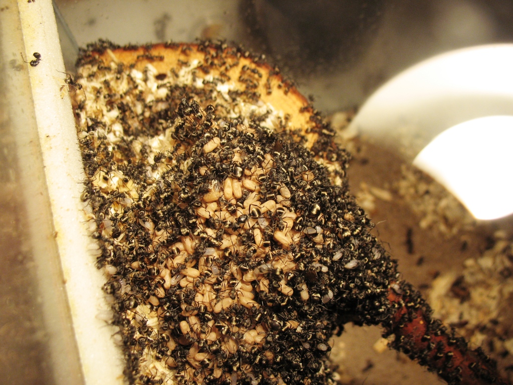 Es ist eine große Kolonie mit vielen hundert Arbeiterinnen und mindestens 9 Königinnen. Sie fressen wirklich sehr viel und vor allem proteinhaltiges ist immer gern gesehen. Honig-Zuckerwasser sowie eine Wassertränke stehen stets bereit.