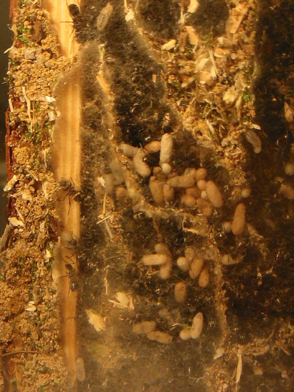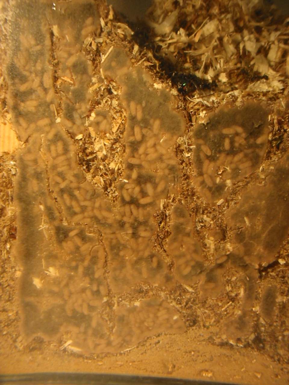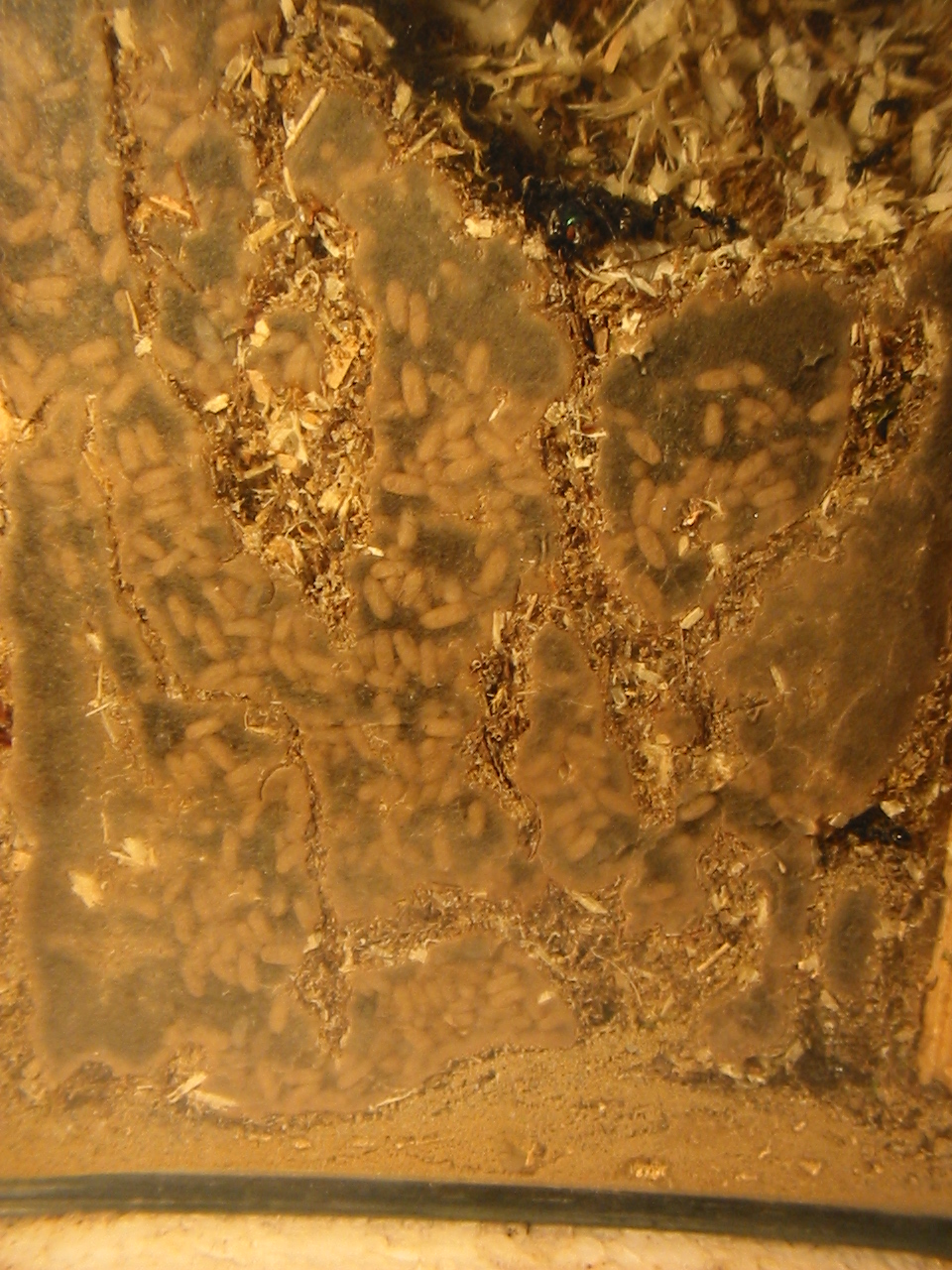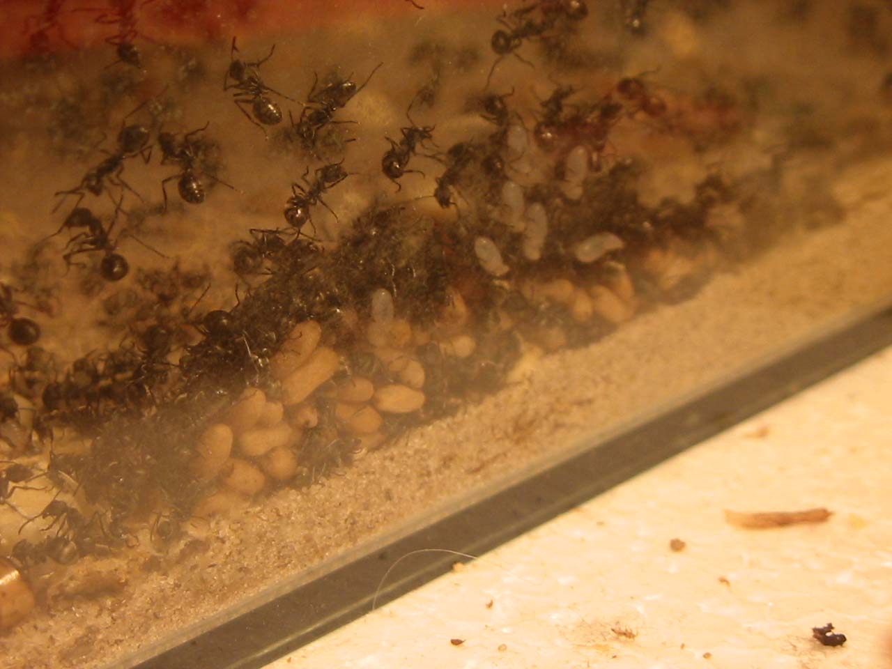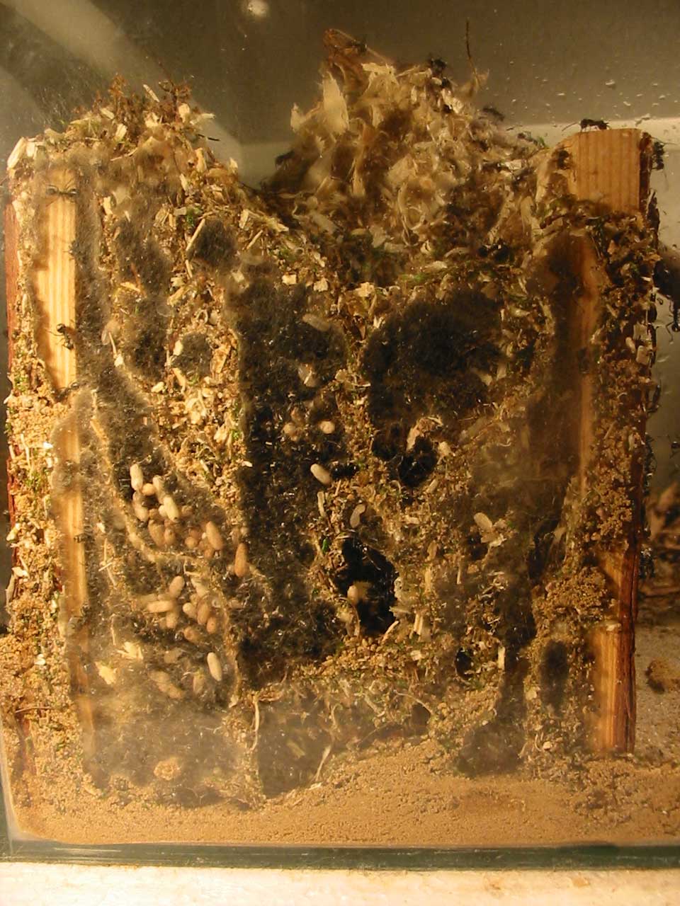 Zu den Nestbauaktivitäten ist zu sagen, dass sie am Anfang relativ wenig und vor allem sehr langsam gebaut haben. Nach einigen Wochen (wahrscheinlich durch neue Brut bedingt), stieg die Aktivität deutlich an und vor allem am Tage sind stets Arbeiterinnen mit Larven unterwegs.