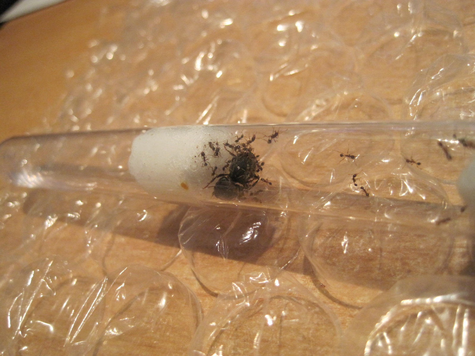 Ich habe von einem Privathalter eine Kolonie Pheidologeton diversus erhalten, auch kostenlos, aber dazu später mehr. Die Kolonie ist in sehr schlechtem Zustand. Es existieren vielleicht noch 20 Arbeiterinnen und die Königin. Brut wurde über Nacht neu produziert (kleiner weißer Eierhaufen), aber ich befürchte das das Überleben der Königin am seidenen Faden hängt. Ich biete alles an Nahrung an was geht und ich kämpfe noch, das könnt ihr glauben.