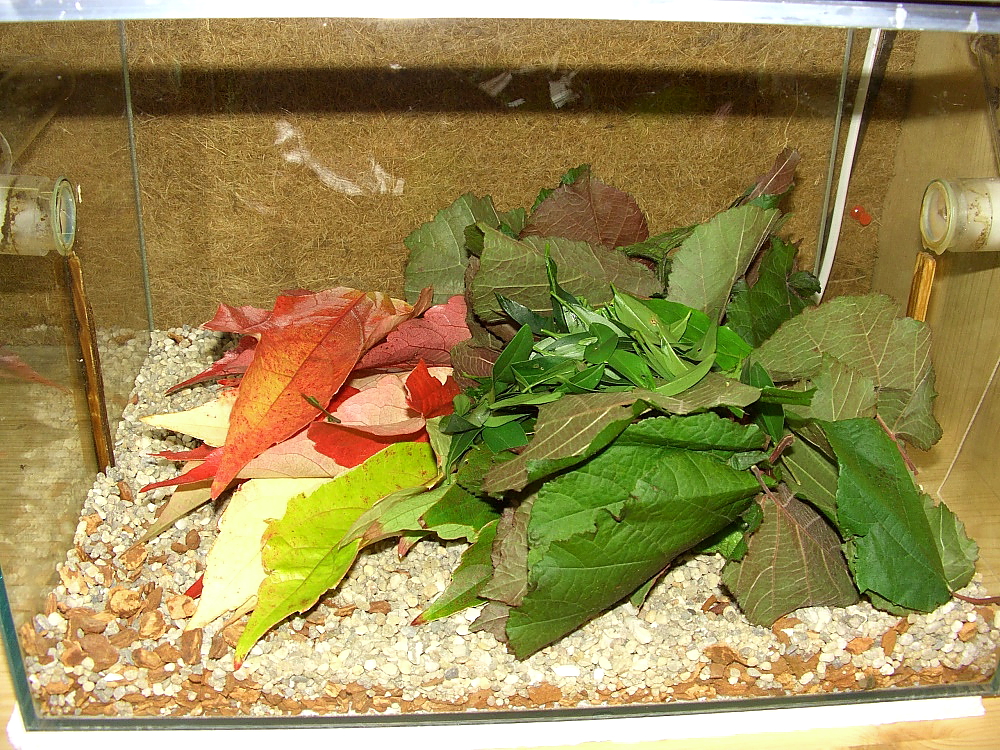 Das abgedunkelte Futterbecken gibt weiterhin eine gute Möglichkeit, oben durch eine Öffnung im Deckel Blätter zu reichen.