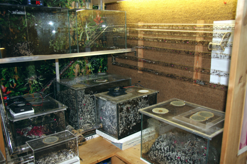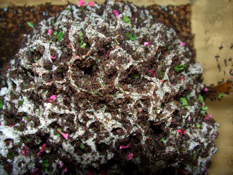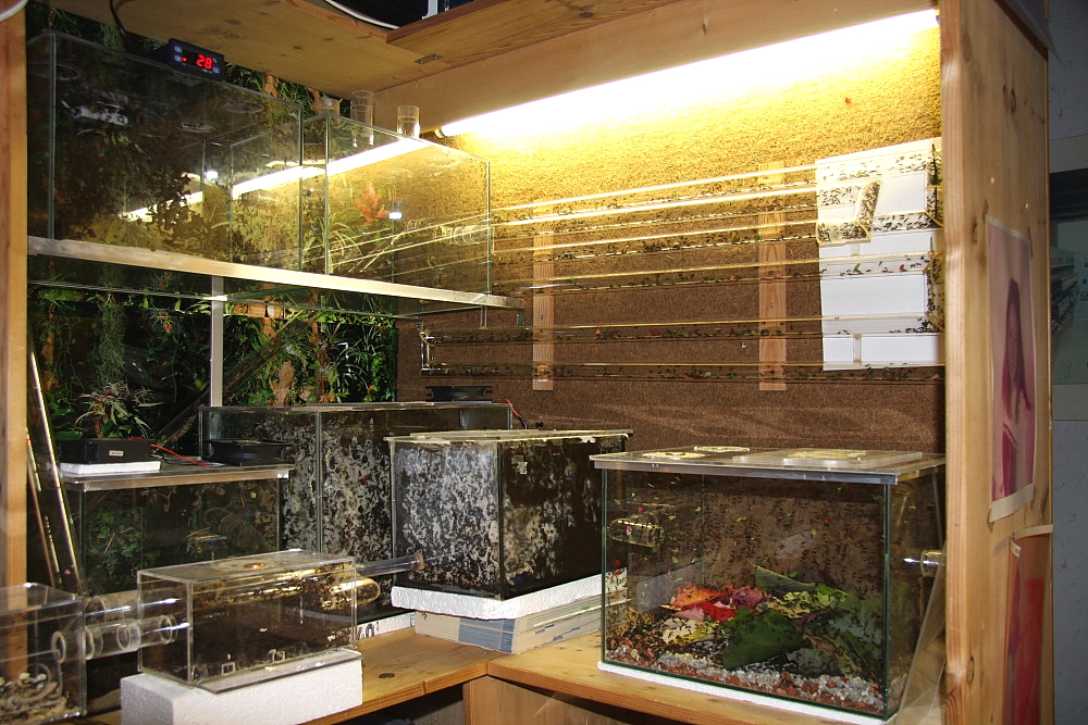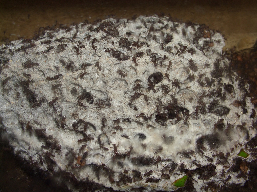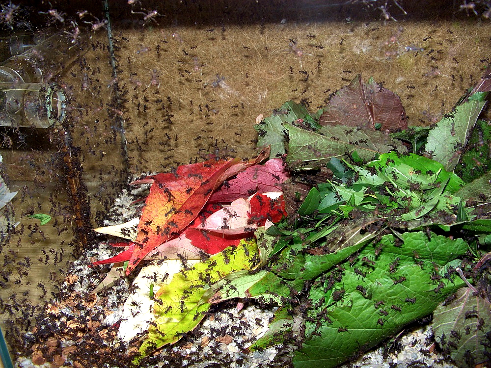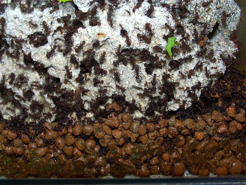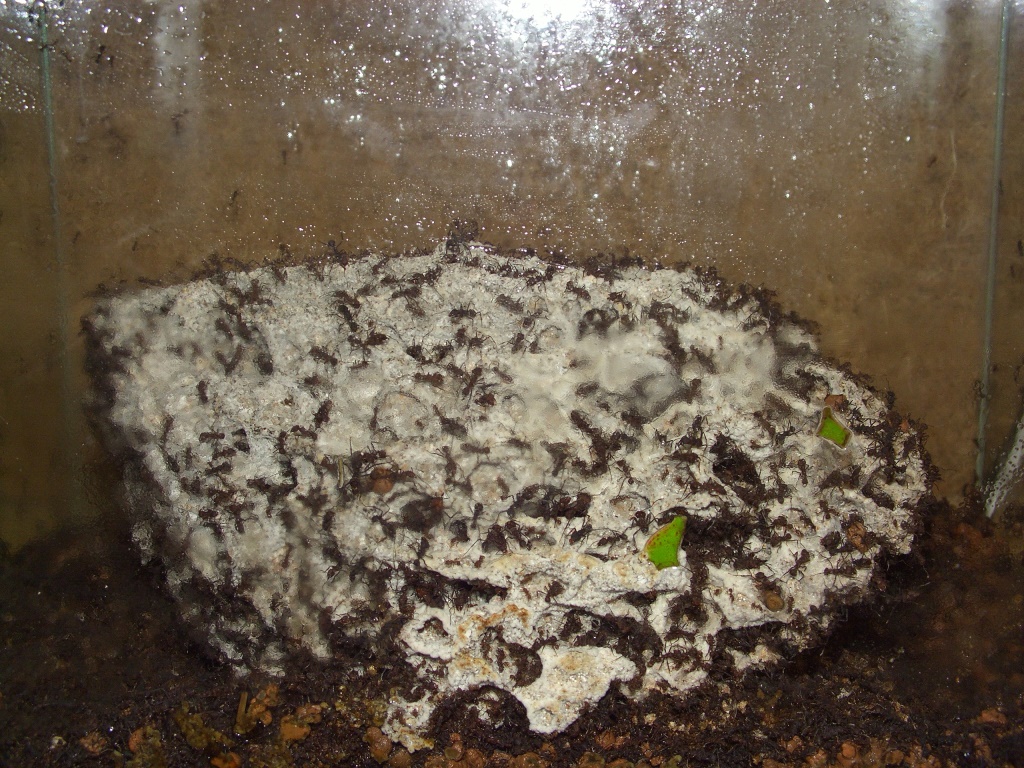 Damit die Ameisen nicht auf die Idee kommen, in diesen Becken auch einen Pilz zu pflegen, halte ich die Luftfeuchtigkeit mit einem Lüfter unter 80%.