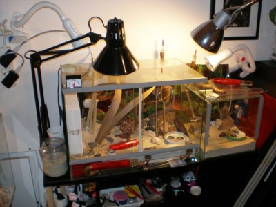 Mit einer Wärmelampe über dem Terrarium.