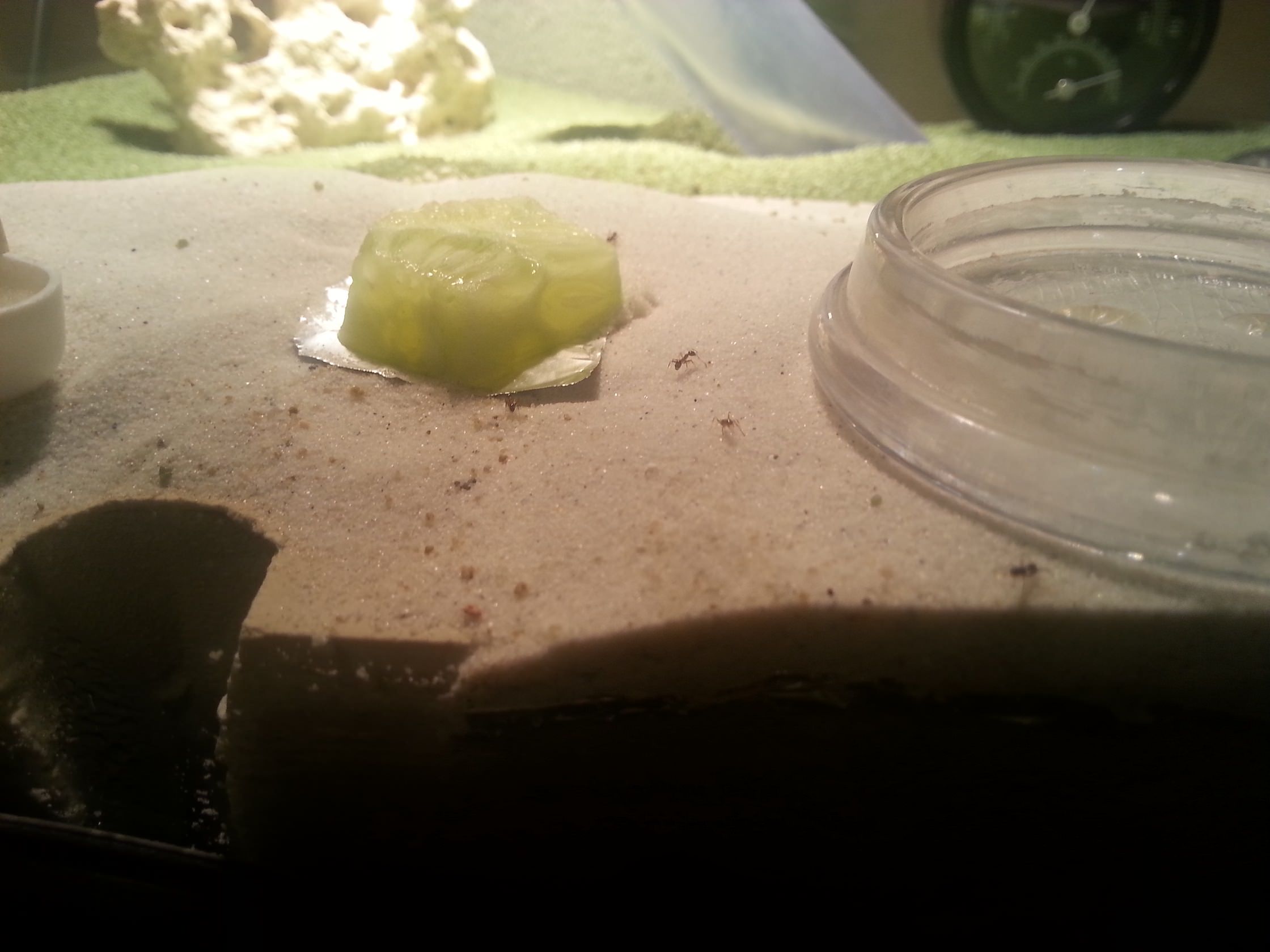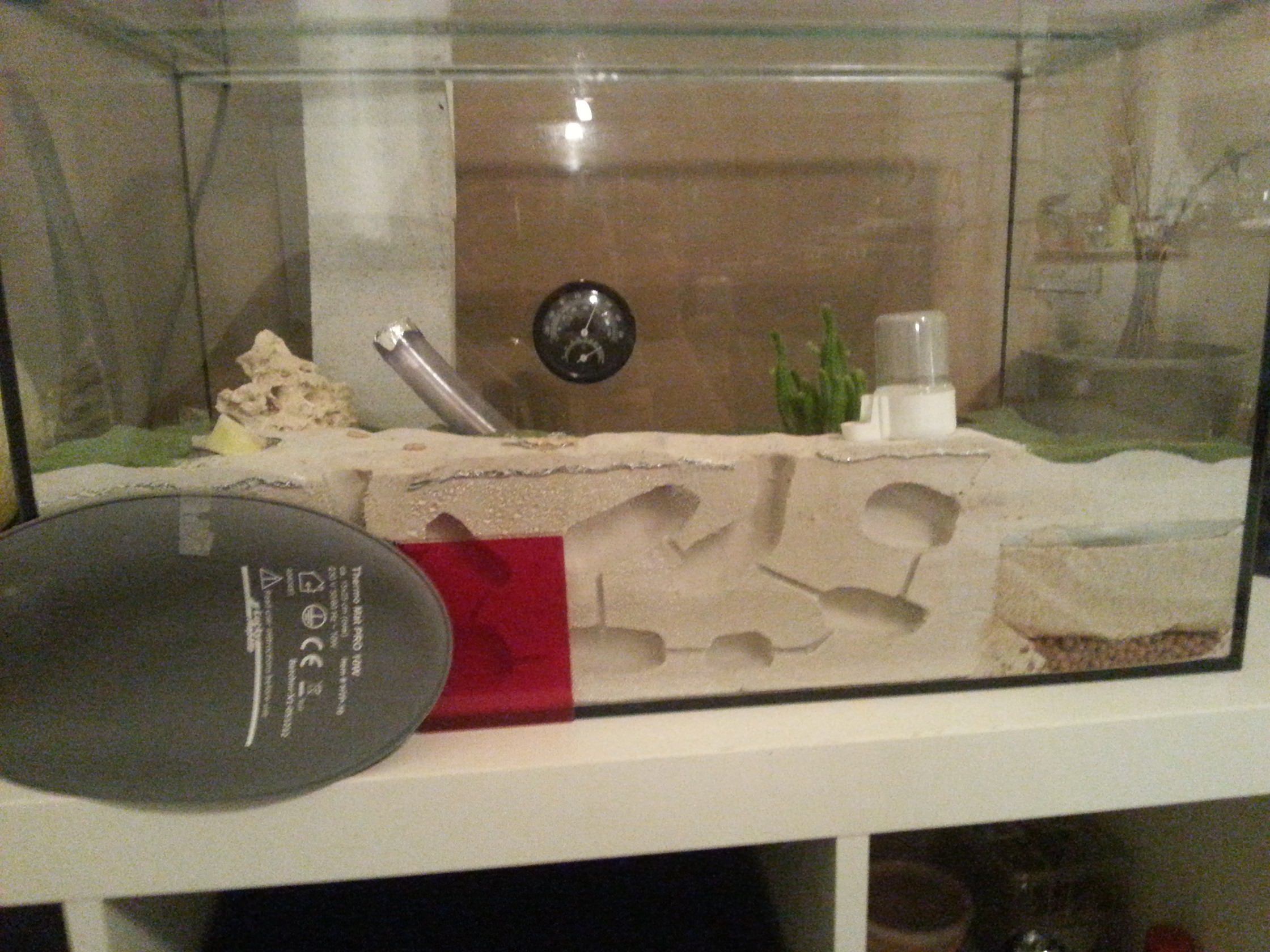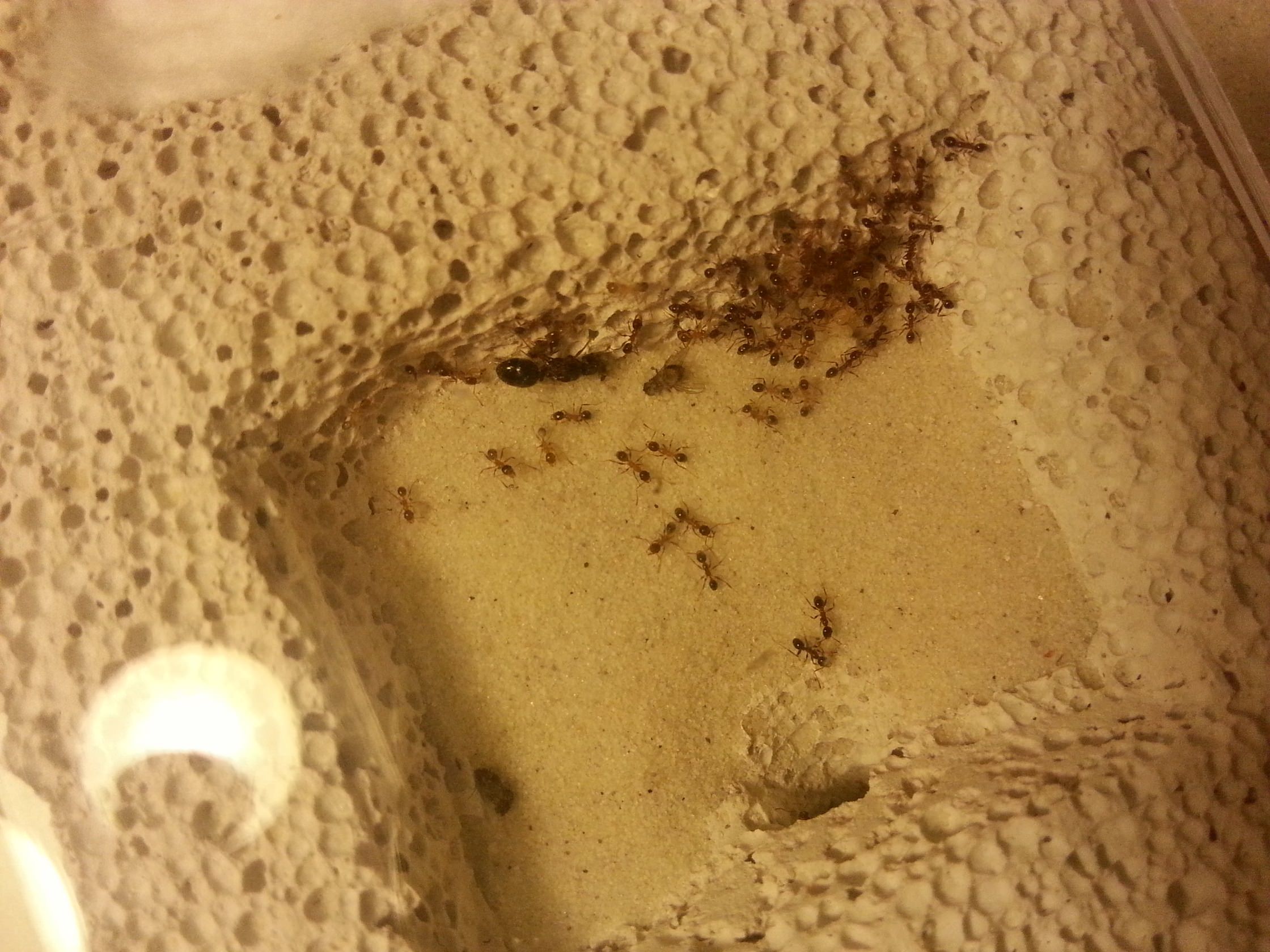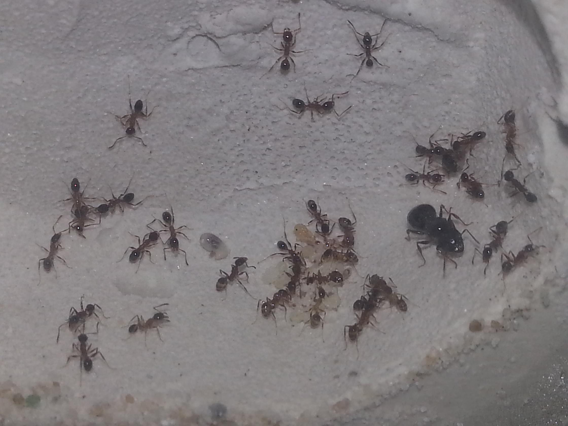 Zunächst kamen die Kleinen samt Reagenzglas in eine kleine Box, mit provisorischem Y-Tong Nest. Zu meinem verwundern zogen sie schon nach wenigen Tagen um. Da ich bei der Box immer wieder Probleme mit dem Ausbruchsschutz und der Luftfeuchtigkeit hatte, durfte die Kolonie gestern Abend dann in das fertige (große) Becken umziehen. Hierbei nahm ich auch gleich noch eine genaue zählung vor. 1 Königin und 64 Arbeiterinnen. Bis jetzt gibt es noch keine Soldaten (bzw. Major-Arbeiterinnen) aber ich denke, dass wird einfach noch ein wenig dauern. Tagsüber halte ich die Temperatur so zwischen 26 und 28 C° Die Luftfeuchtigkeit bei etwa 70%. Nachts fallen die Werte dann ein wenig ab. Beheizt wird alles mit einer Heizmatte.