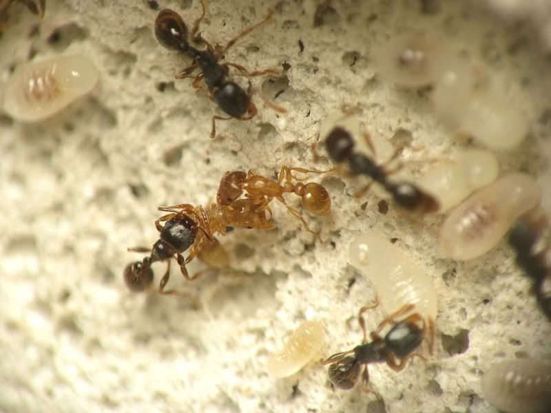 In the center: first own workers of Big Berta(T.caespitum) and S.testaceus hand in hand. They look so Lovely :mrgreen: . In the left upper corner is enormous worker from adult colony .