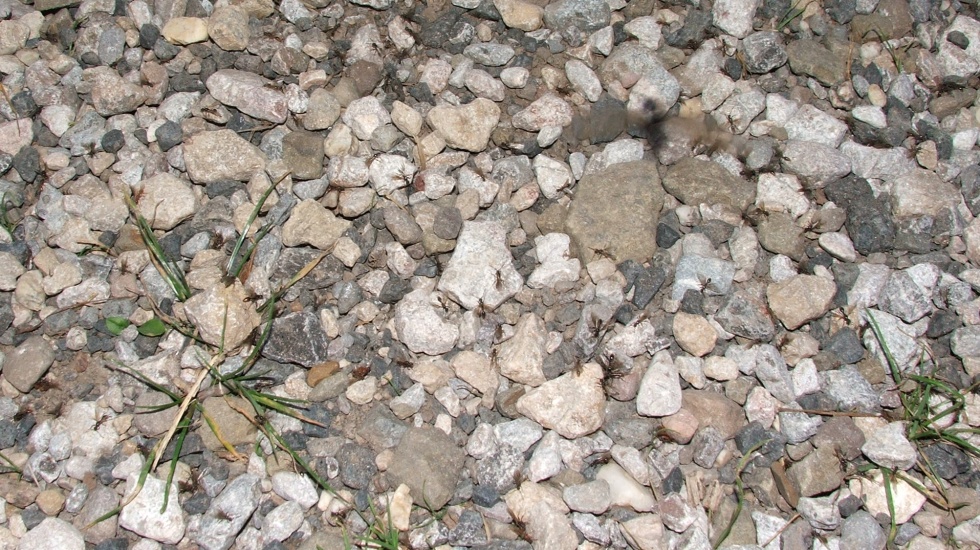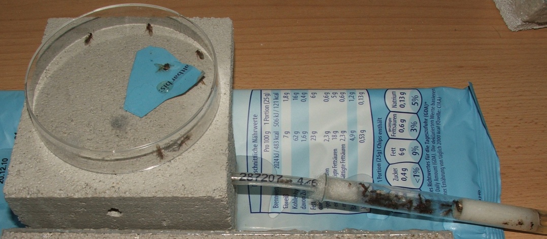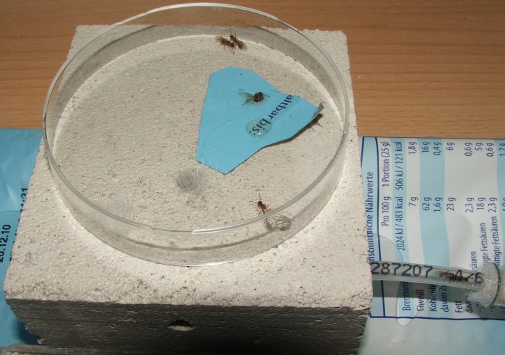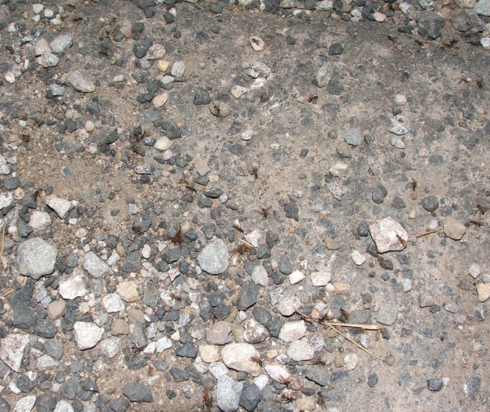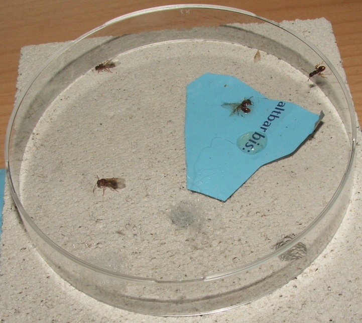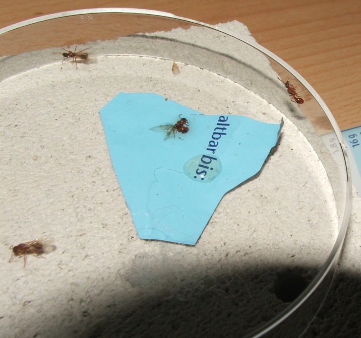 Zum Schluss noch eine interessante Beobachtung, ich habe keine Nester gesehen, von denen sie aus in direkter Nähe gestartet wären, sie scheinen sich also tatsächlich an der Wegmarke orientiert zu haben, außerdem entflügelten sich die Königinnen nicht nach der Kopulation, ließen aber auch keine weitere zu, sie liefen umher und starteten wieder - ich vermute, dass sie nun wieder auf der Suche nach ihren Nestern waren, einige mitgenommene Exemplare fouragieren in der Arena immer noch...