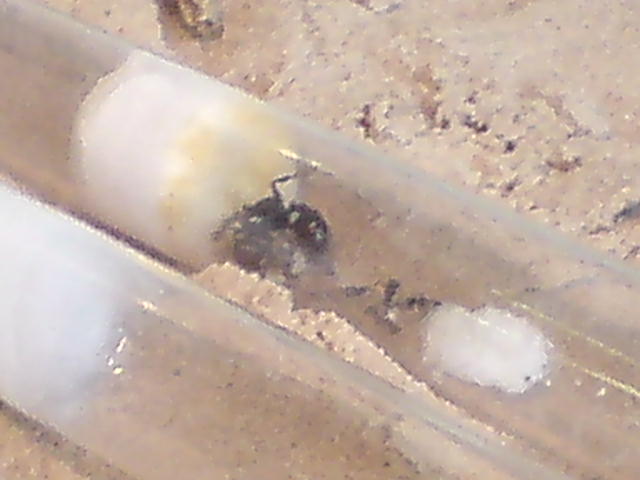 Now then the numbers are, 1 Queen 9 workers 3-7 larvae 1-2 white naked pupae and 2 browny pupae !! but no eggs proly got eaten during transport >.<
