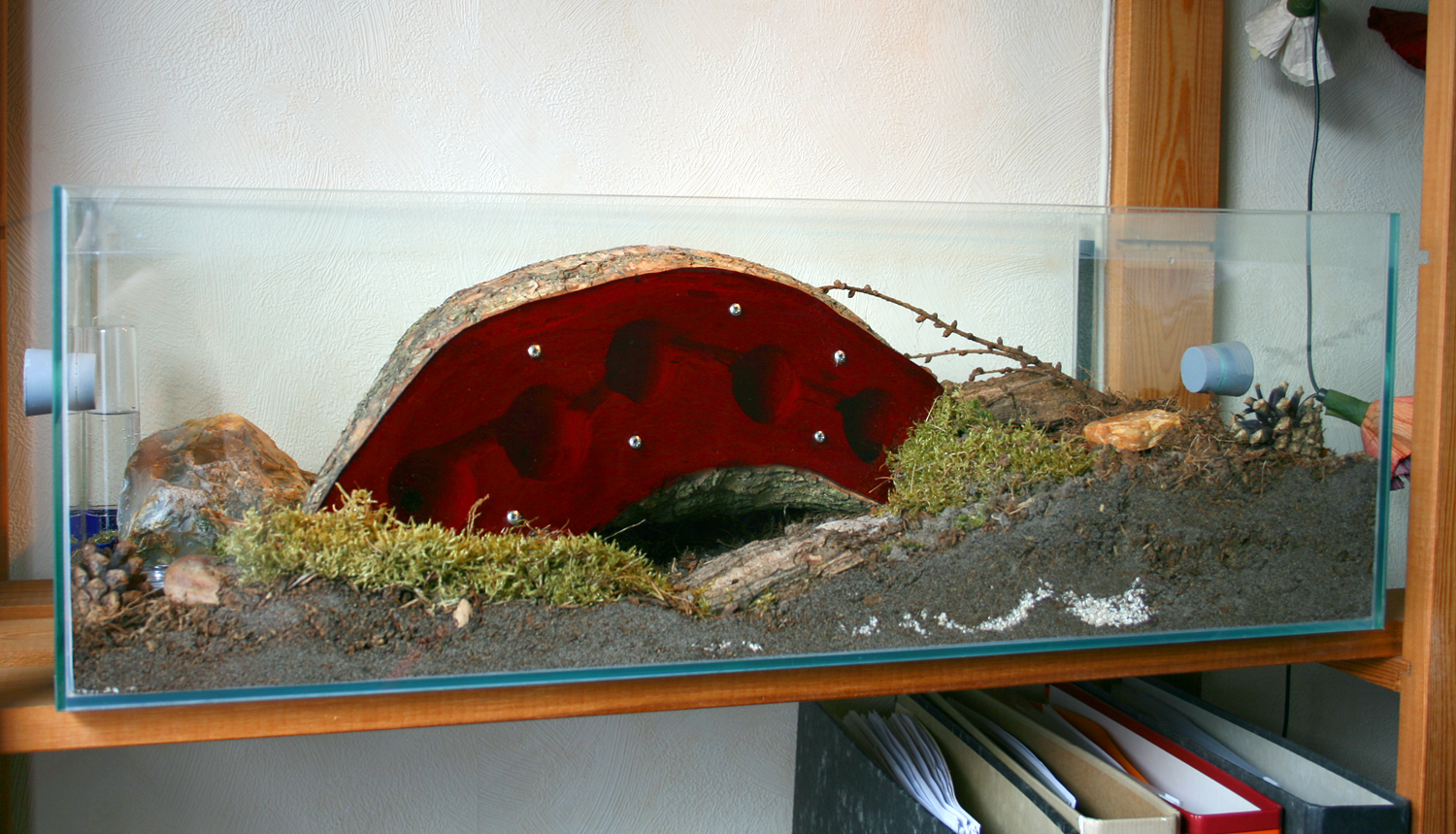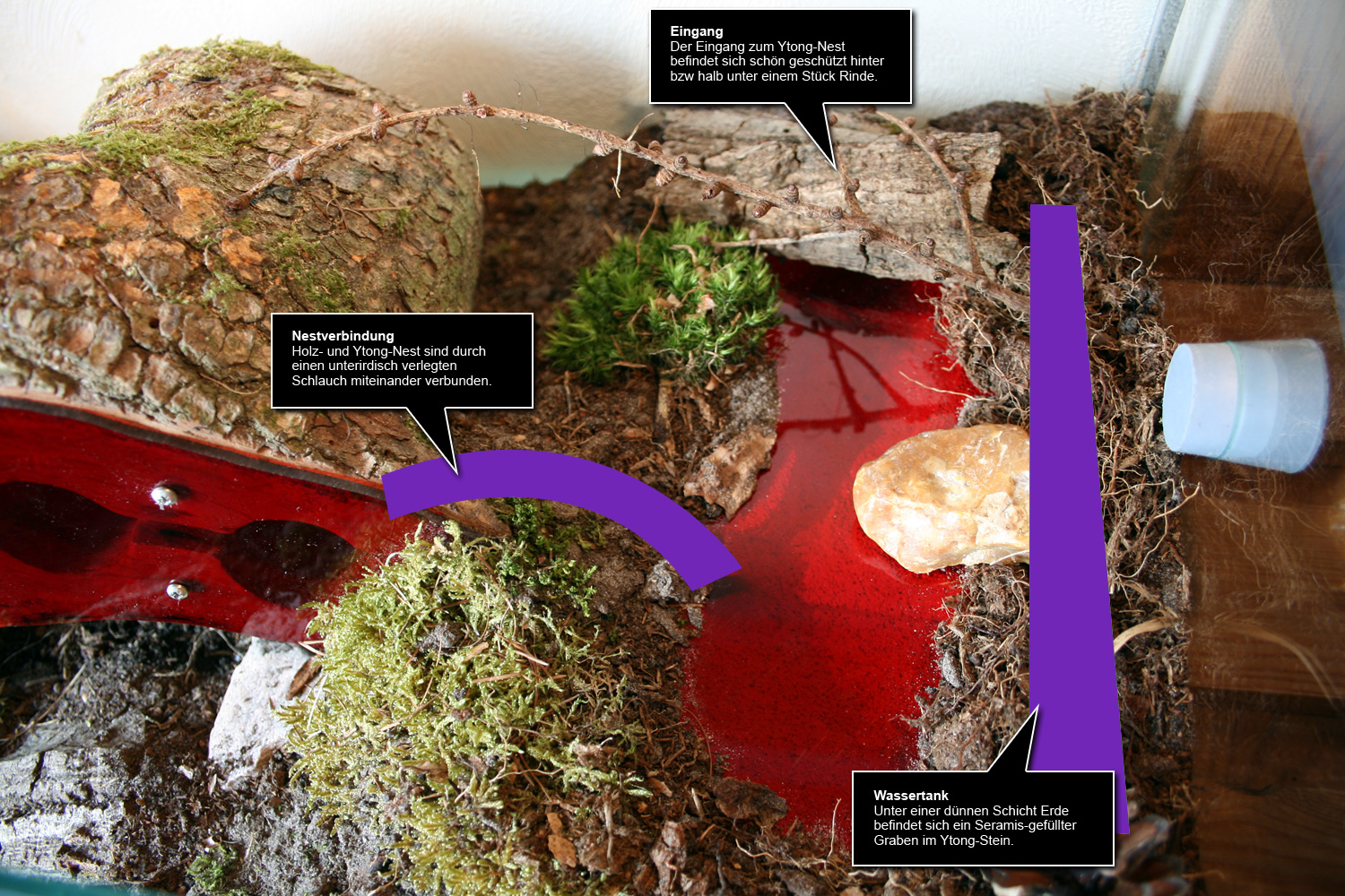 Hier wollte ich zunächst, da es am natürlichsten ist, einfach ein Erdnest anbieten - also schlichtweg an einer Stelle im Becken genug Erde aufschütten, dass gebuddelt werden kann, und dort befeuchten. Diesen Ansatz habe ich jedoch wieder aufgegeben, da ich gern Waldboden verwenden wollte und gelesen habe, dass hier die Schimmelgefahr durchs Bewässern recht hoch ist. zudem sollten laut einiger Seiten die beiden Nester eine Verbindung haben, also hätte die zu befeuchtende Erde nah am Holznest sein müssen, so dass auch dieses womöglich schimmeln würde. Also mußte etwas anderes her:
