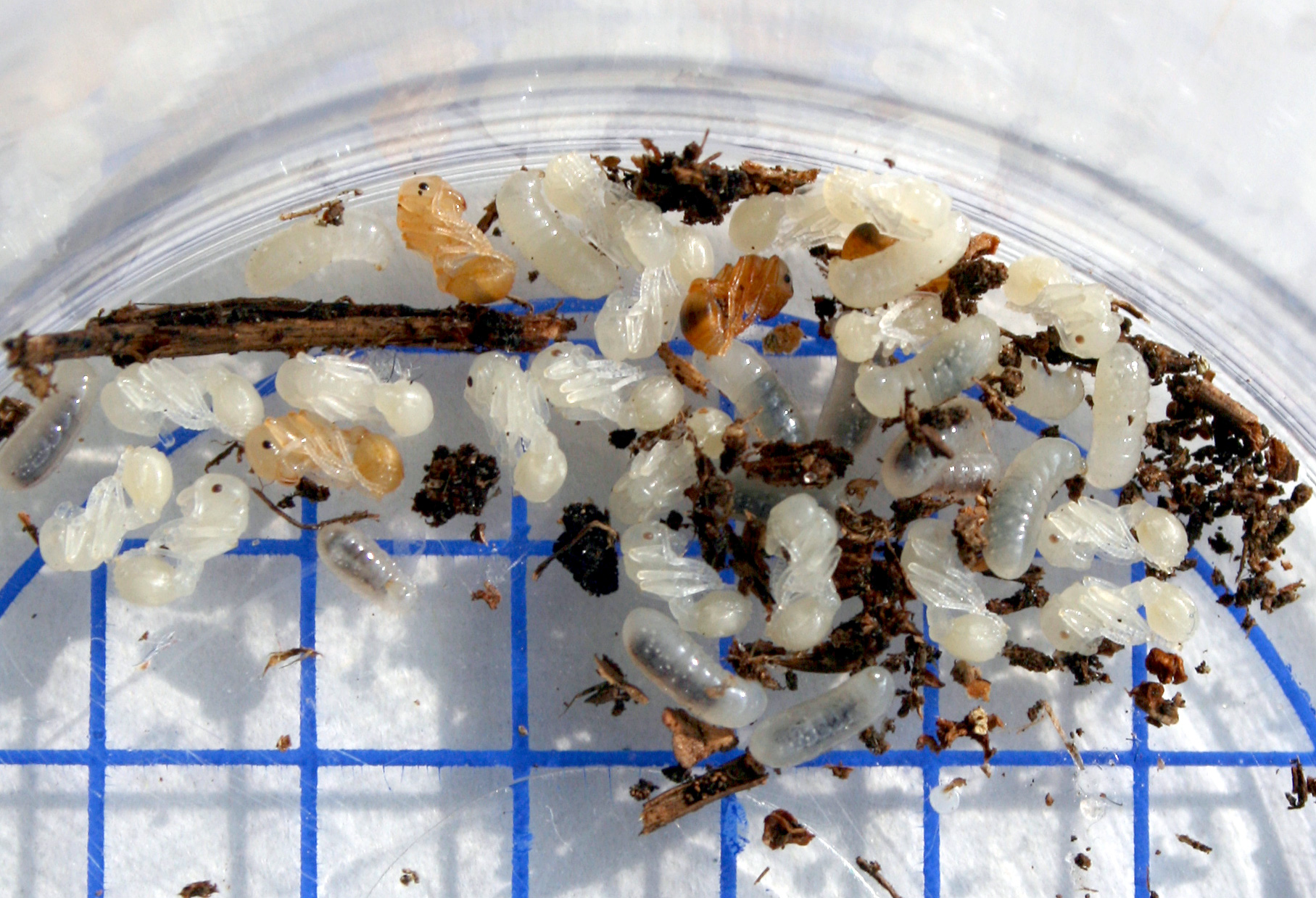 Nach dem 9ten oder 10ten umgedrehten Holzstück hab ich dann tatsächlich ein Nest freigelegt, es waren direkt Massen an Larven und Puppen sichtbar.