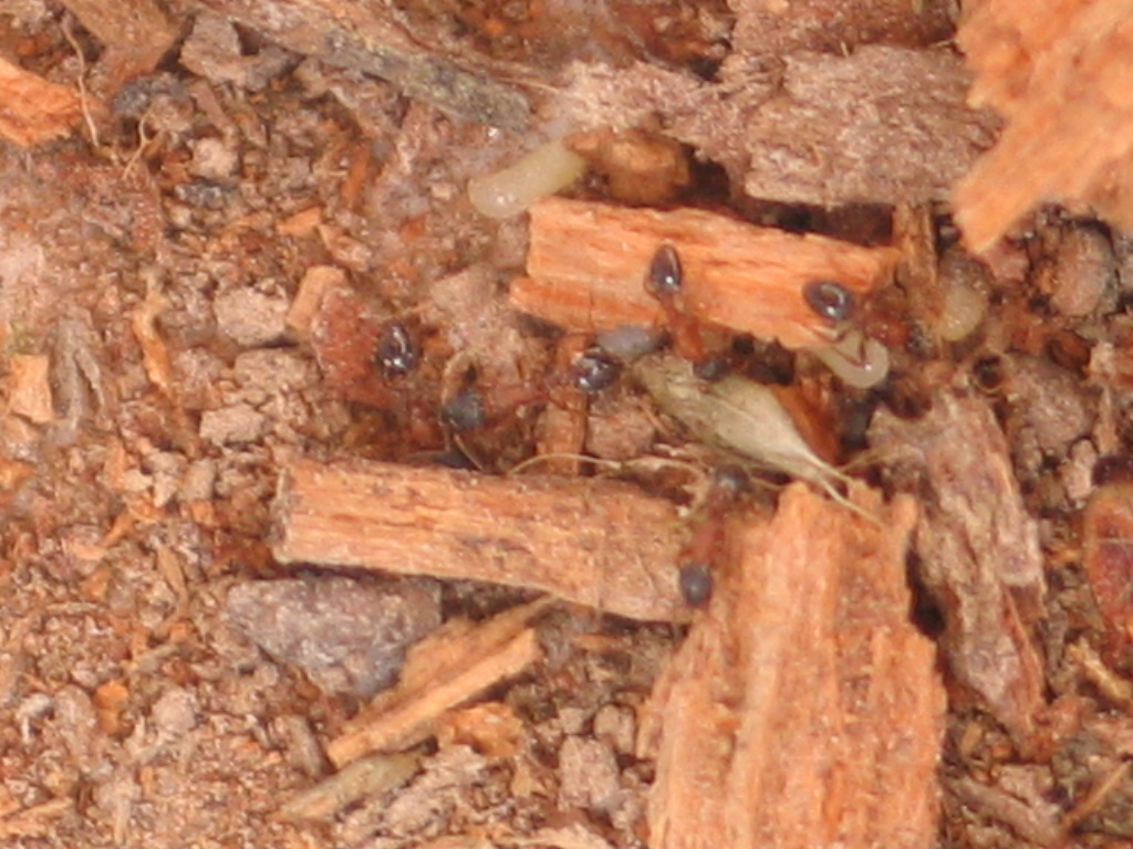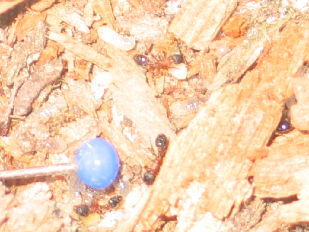 Janzi hat ja vermutlich mit Absicht die Glaskopfstecknadel im Bild 5 untergebracht. Ich habe eine solche Nadel auf ein Lineal gelegt und festgestellt, dass der Kopf einen Durchmesser von ca. 2.5 mm hat. Also ist die Ameise daneben nicht wesentlich länger als 2.5 bis 3 mm. Damit scheidet die größere L. acervorum aus. L. gredleri hat eine andere Farbverteilung, und mehr als die drei gibt’s in D nicht. Wie Janzi in der „Beschreibung“ auf 5 mm kommt, muss er wohl selber erklären.