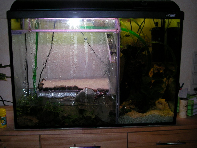 Ausbruchsicher ist das Ding. Aber ich hab Angst, dass einige ertrinken, denn an den Scheiben entlang krabbeln können sie ja theoretisch. Wenn sie dann vom Wasserfilm runtergespült werden ist es aus. Auch könnten einige die Arena zum unfreiwilligen Baden verlassen.
