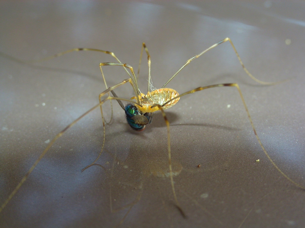 Ist sie danach wenigstens selbst zum Futter geworden, damit die Fliege nicht umsonst gestorben ist? Hätte ja eine Kolonie mehr von. Oder sollte es sich hier sogar um einen gehaltenen Weberknecht handeln?