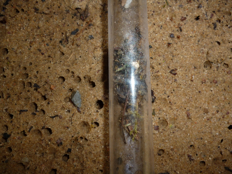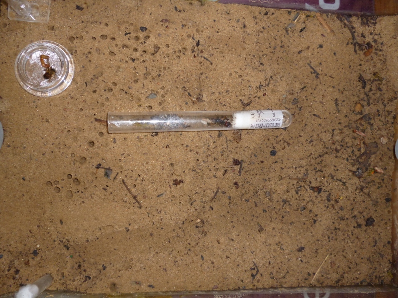 Mittlerweile ist das Reagenzglas bis fast an die Decke voll gebaut. Die Eier (schöne gelbe Färbung) sind an die Wand geheftet. Die Gyne ist ziemlich ruhig, bewegt sich aber noch. Eigentlich ist diese Art doch ganz ruhig und weniger aggressiv. Man sollte sie aber auch nicht stören oder ärgern, sonst sind sie schneller als man denkt. Wenn sie etwas angreifen, strecken sie die Gaster nach vorne. Kann es sein, dass sie Säure spritzen will? Kann man irgendwie die Säureproduktion beeinflussen?