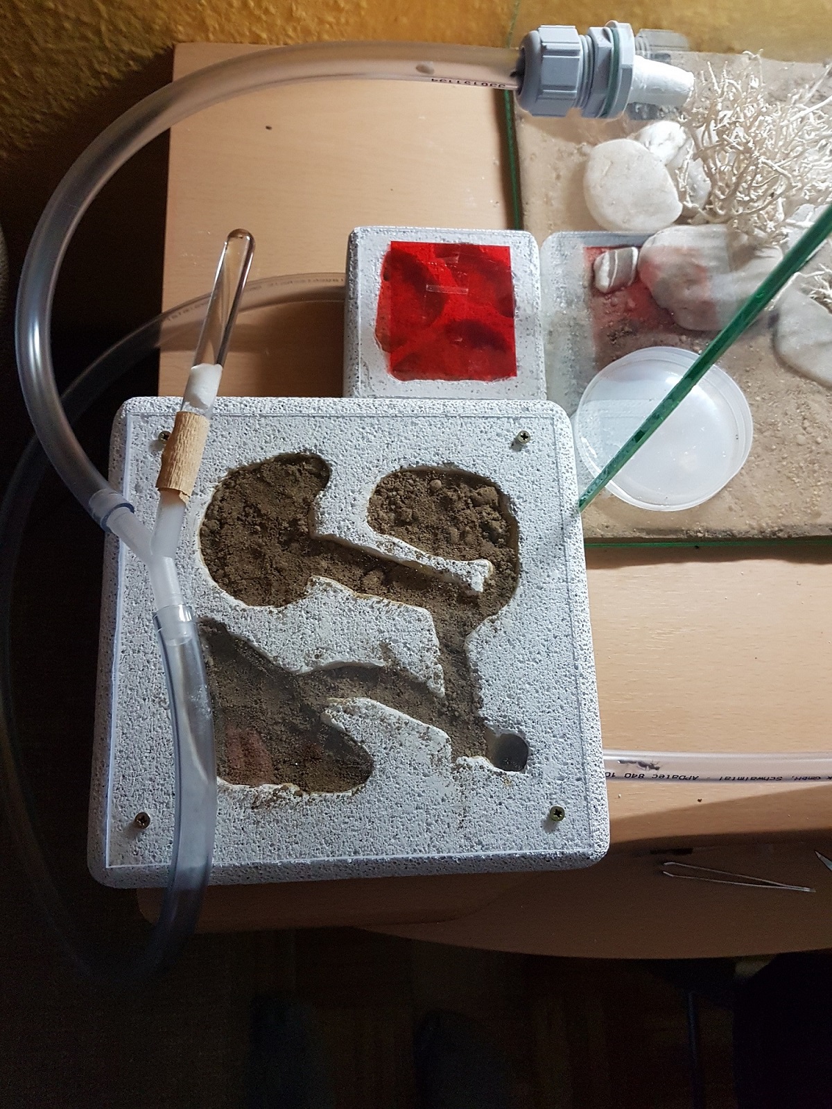 Kammern ca. 5 - 10 cm , Gänge ca. 1 cm , Wassertank sind oben 3 Bohrlöcher die ca. 7 cm tief reichen .... ( will es so mal versuchen )