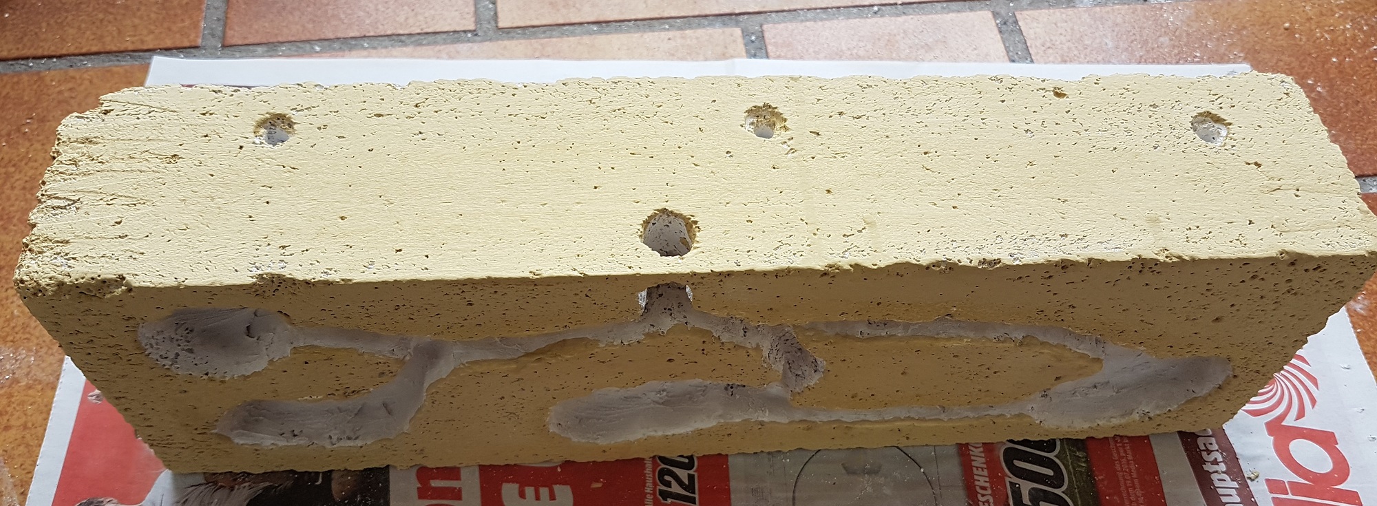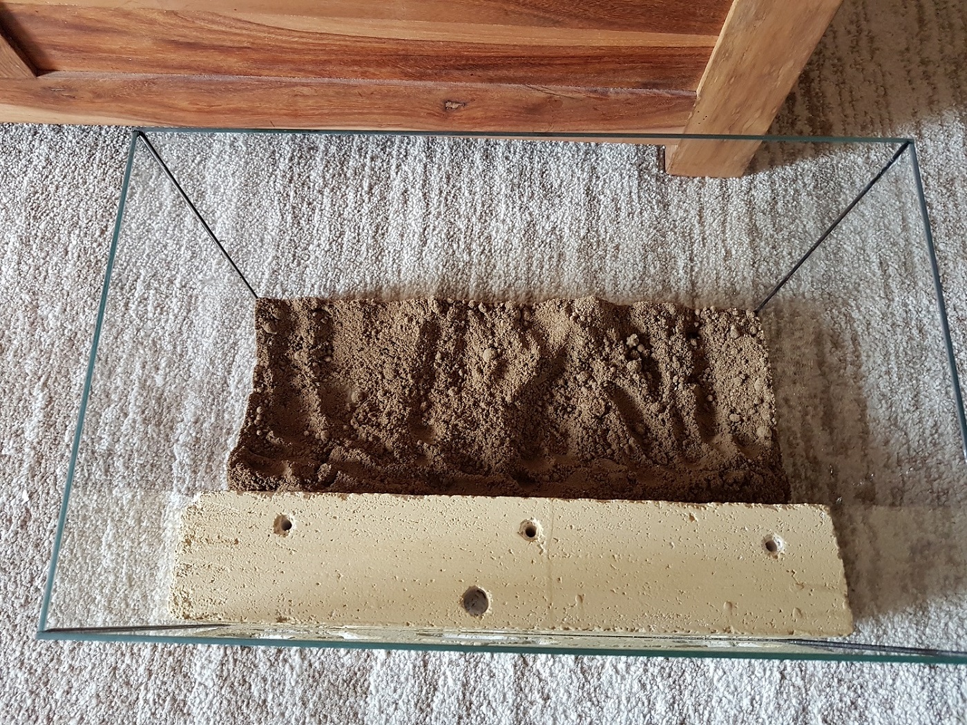 Diese Nest habe ich so angefertigt das es genau in mein 40 x 25 x 25 cm Becken passt. Hinten wird danach alles mit Sand oder Sand - Lehm aufgefüllt bis es die gleiche höhe vom Ytong-Nest hat. Nach der Bearbeitung der Gänge und Kammern habe ich wieder die Gänge und Kammern mit Gips bestrichen und den Ytong vorne und Seitlich mit Lehmfarbe - beige bestrichen. Ich denke ich werde das Becken mit so einer Farbe auch befüllen mal sehen.