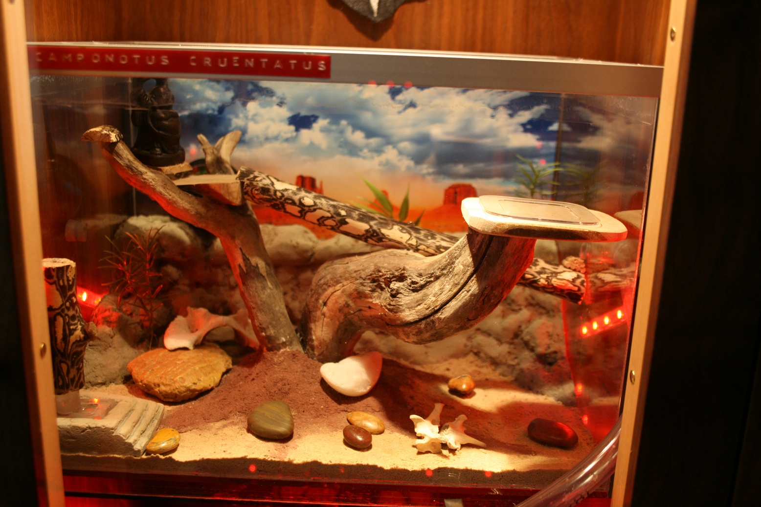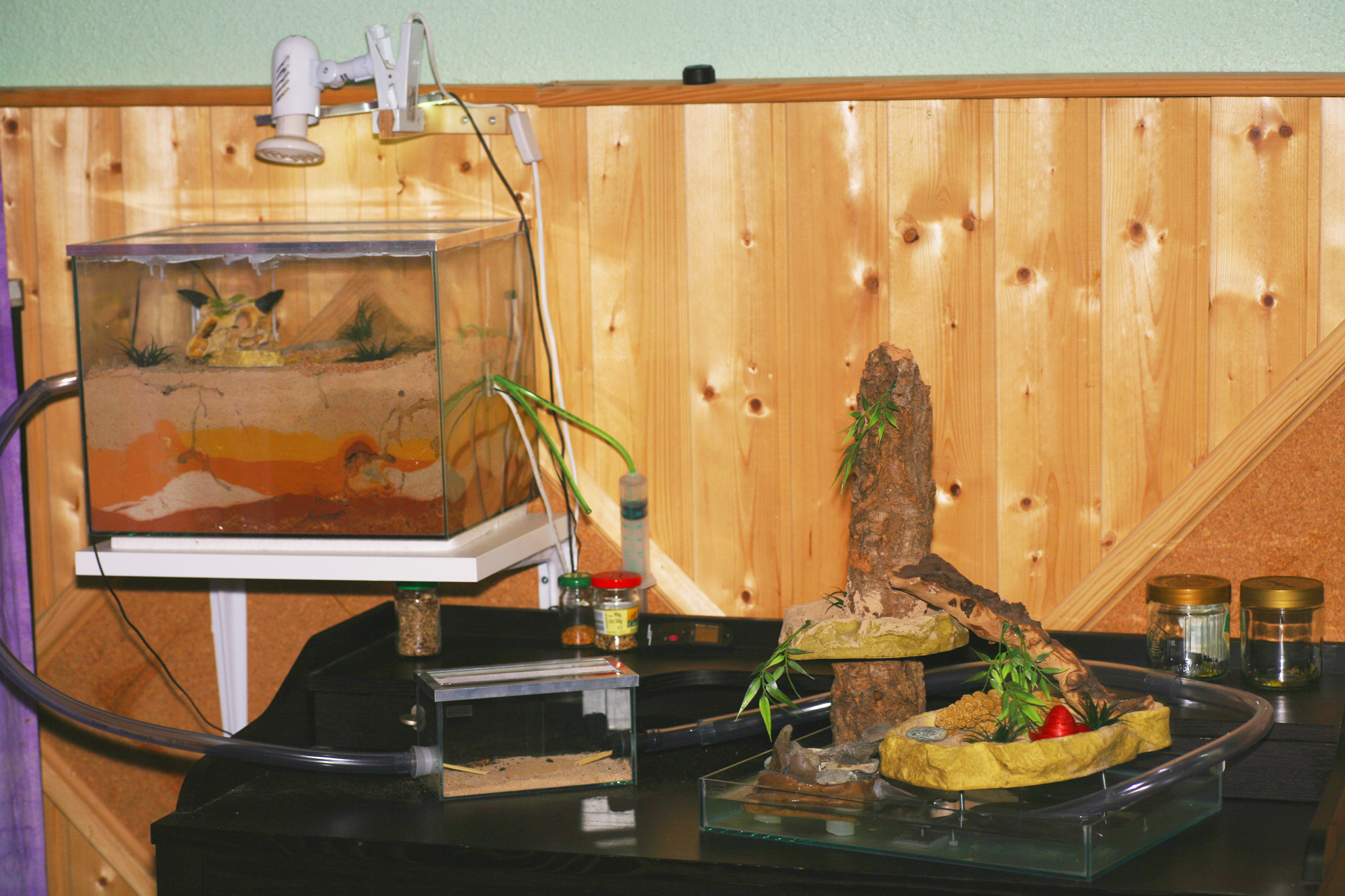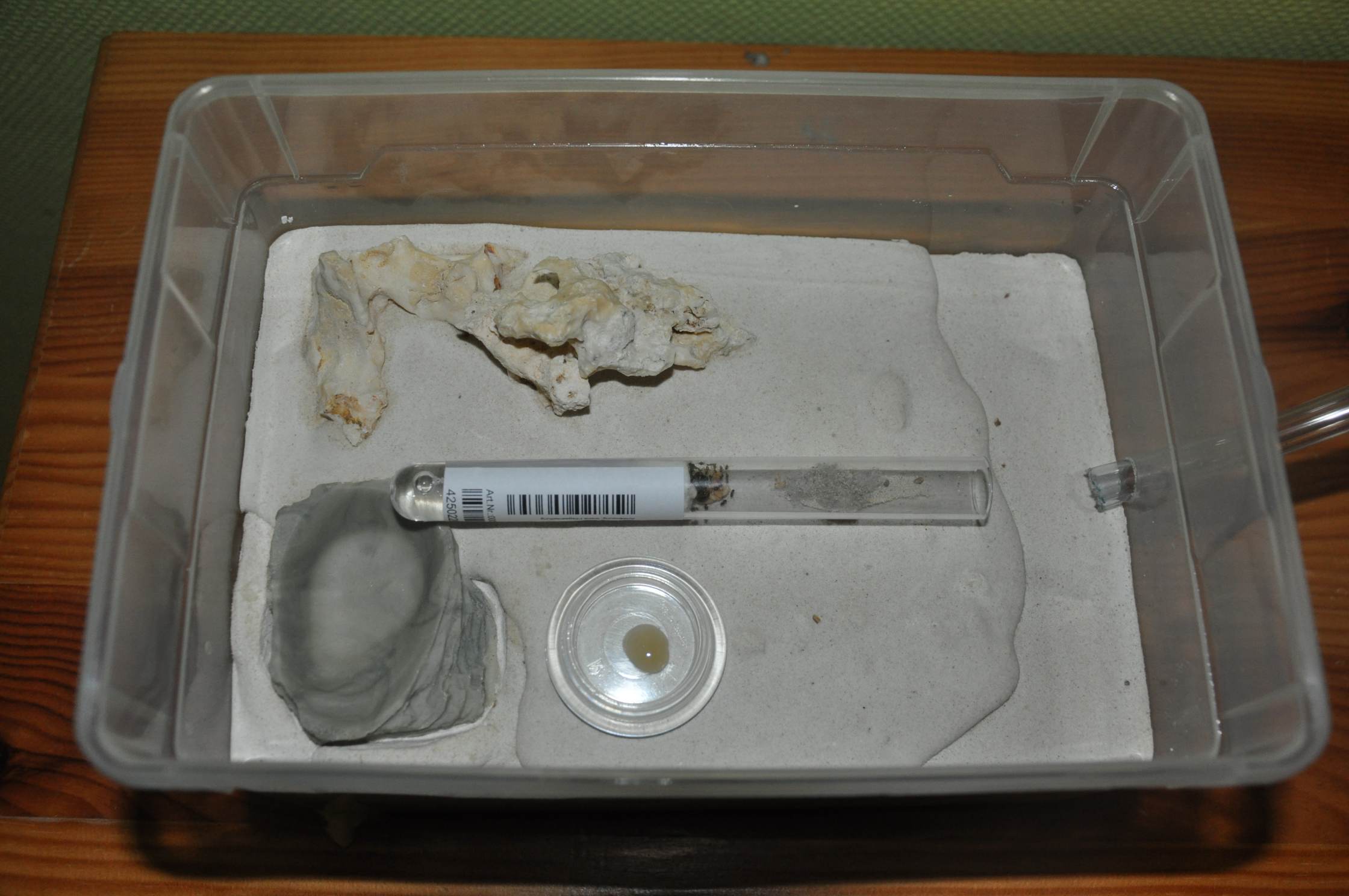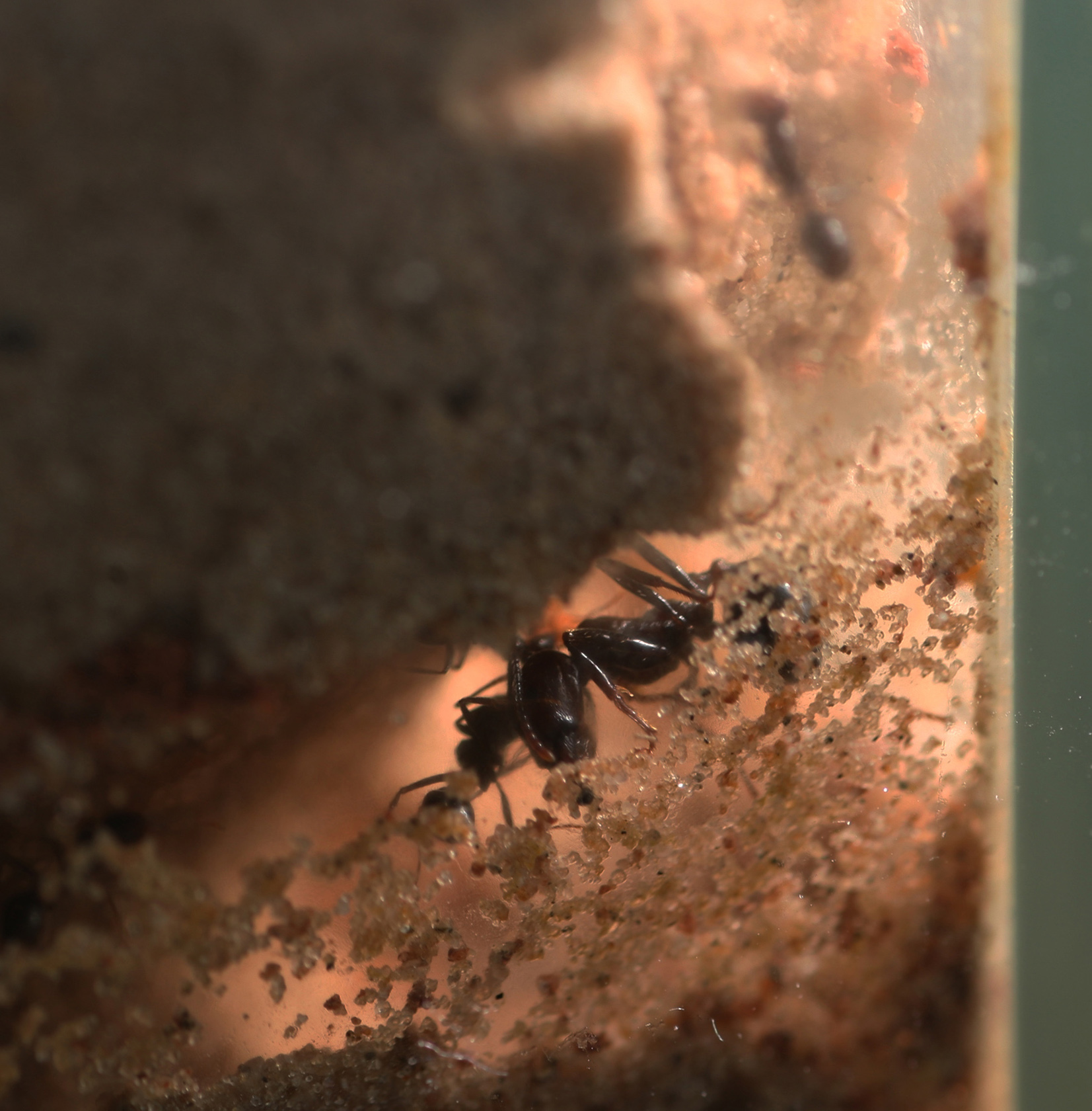 die Bewohner:Und die Wohnung:Die "Arena/Farm" hat im inneren einen frei hängendes Heizkabel mit dem ich nochmal ein wenig nachheitzen kann, da die Anlage im Keller steht. Befeuchtet wird rechts unten, die Feuchtigkeit zieht bis ca 3/4 durch die Farm, wodurch verschiedene Feuchtigkeits Zonen entstehen. Wie oft ich nachfüllen muss, zeigen mir meine Ameisen recht schön. Den sie haben am linkersten oberen Ende ihres Reiches eine feinadrige Belüftungsanlage gebaut, mit der sie die Feuchtigkeit im Bau regulieren. (ist immer verschlossen wenn ich lange nicht befeuchte und offen wenn es nass wird.)