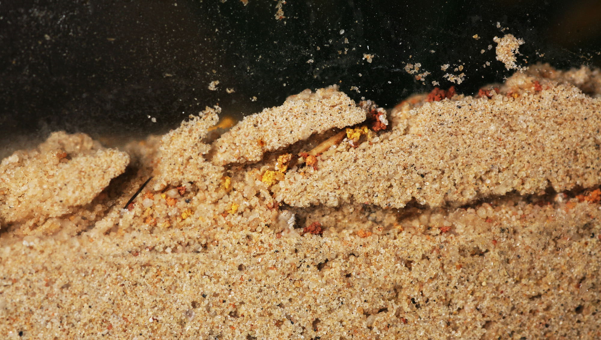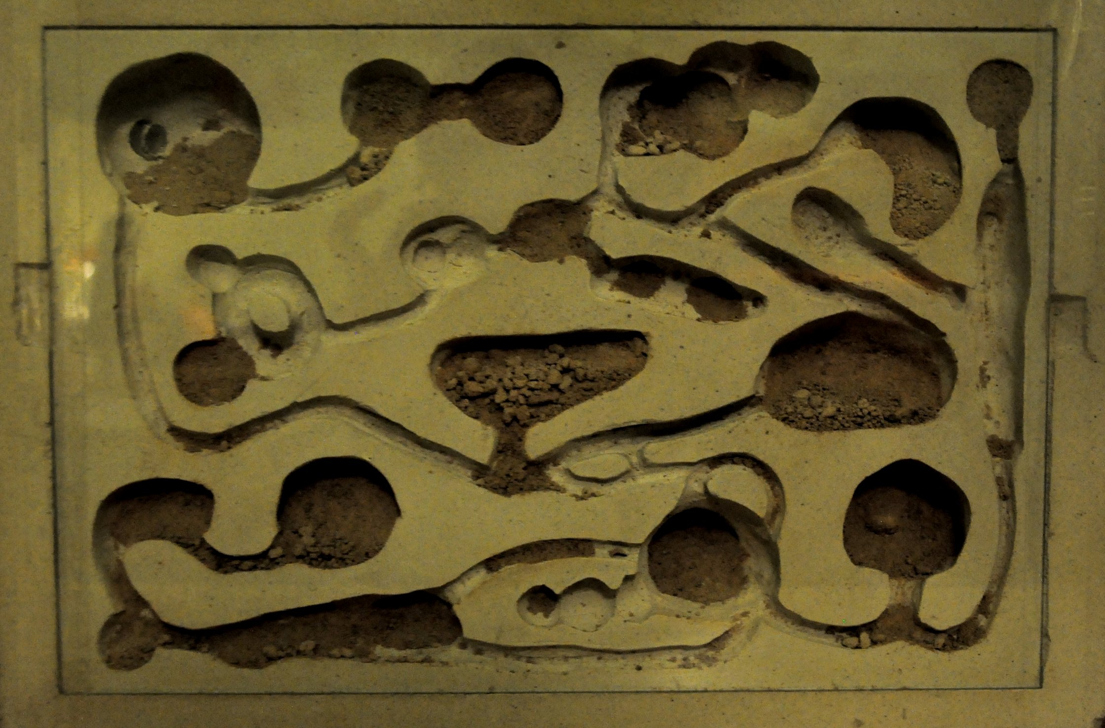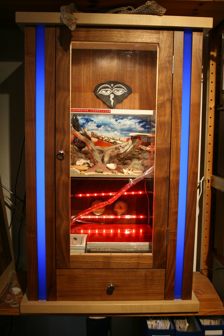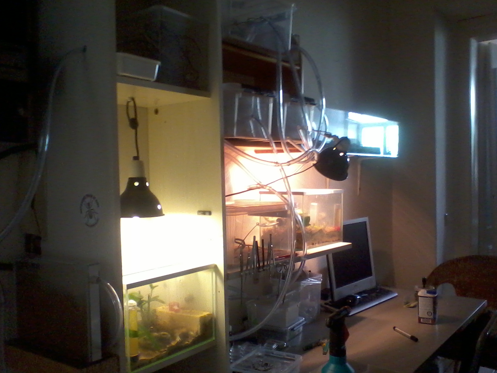 die Bewohner:Und die Wohnung:Die "Arena/Farm" hat im inneren einen frei hängendes Heizkabel mit dem ich nochmal ein wenig nachheitzen kann, da die Anlage im Keller steht. Befeuchtet wird rechts unten, die Feuchtigkeit zieht bis ca 3/4 durch die Farm, wodurch verschiedene Feuchtigkeits Zonen entstehen. Wie oft ich nachfüllen muss, zeigen mir meine Ameisen recht schön. Den sie haben am linkersten oberen Ende ihres Reiches eine feinadrige Belüftungsanlage gebaut, mit der sie die Feuchtigkeit im Bau regulieren. (ist immer verschlossen wenn ich lange nicht befeuchte und offen wenn es nass wird.)