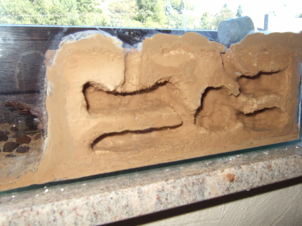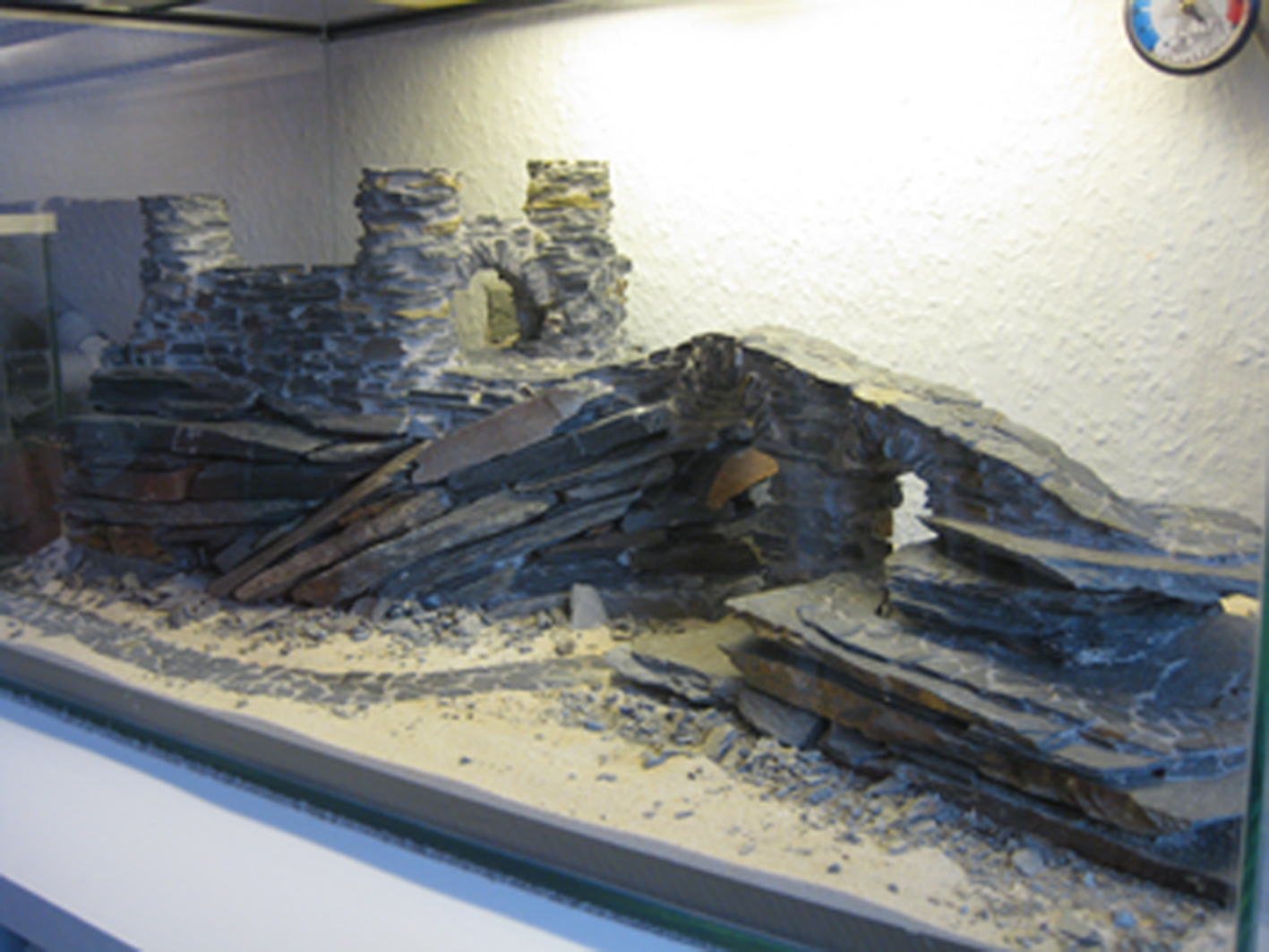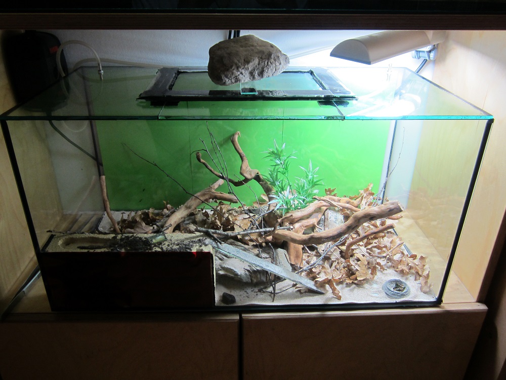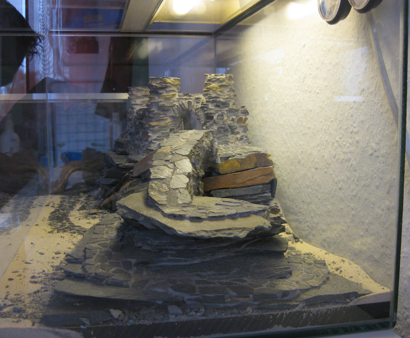 Das ganze Becken hatte ich ursprünglich für Fische zusammengeklebt. Jetzt leicht umfunktioniert für meine neuen Lieblinge :) Der ganze Innenausbau besteht aus einem ganzen Ytongstein. Die Restlücken zum Glas hab ich mit Gips ausgegossen.