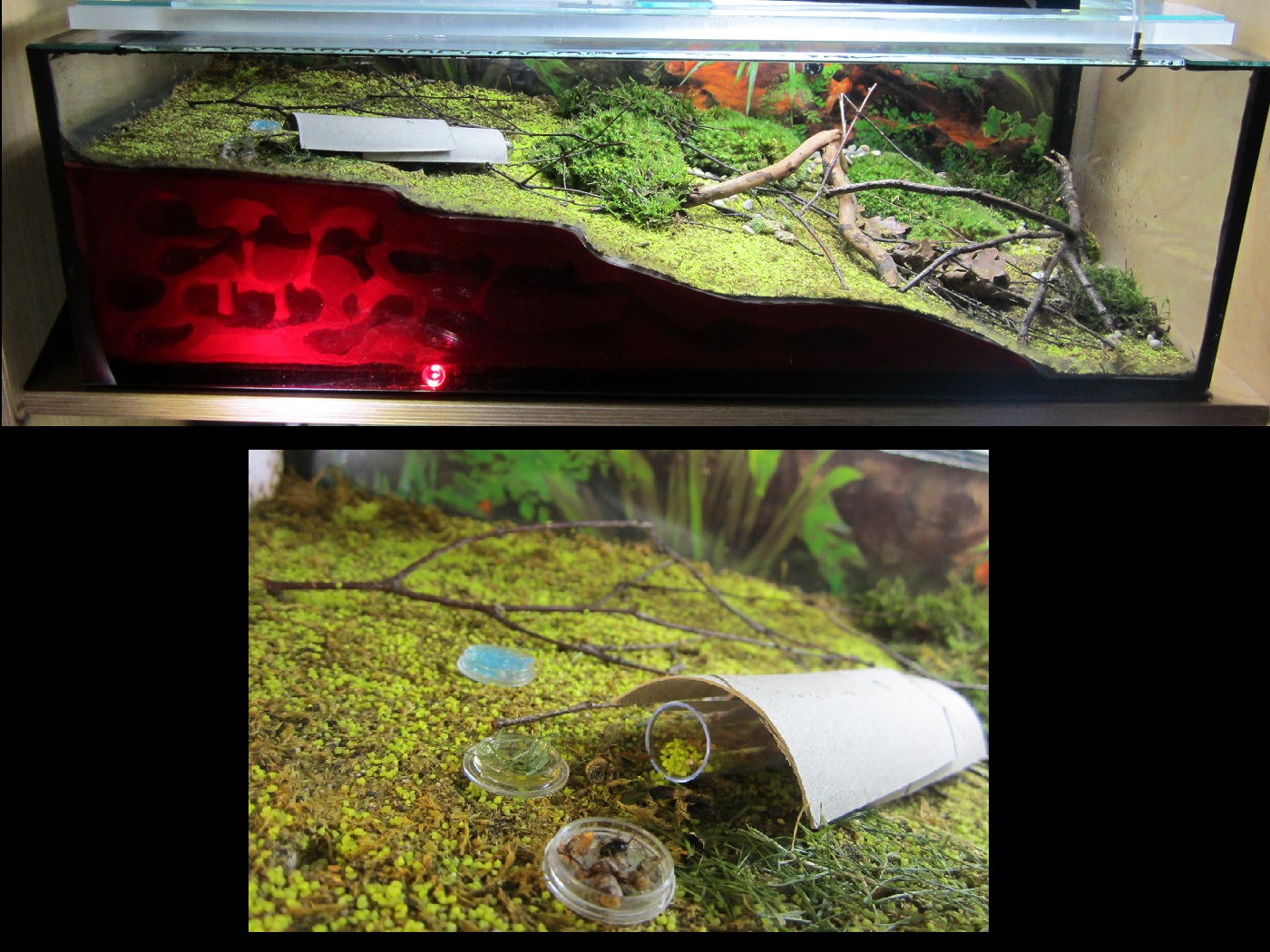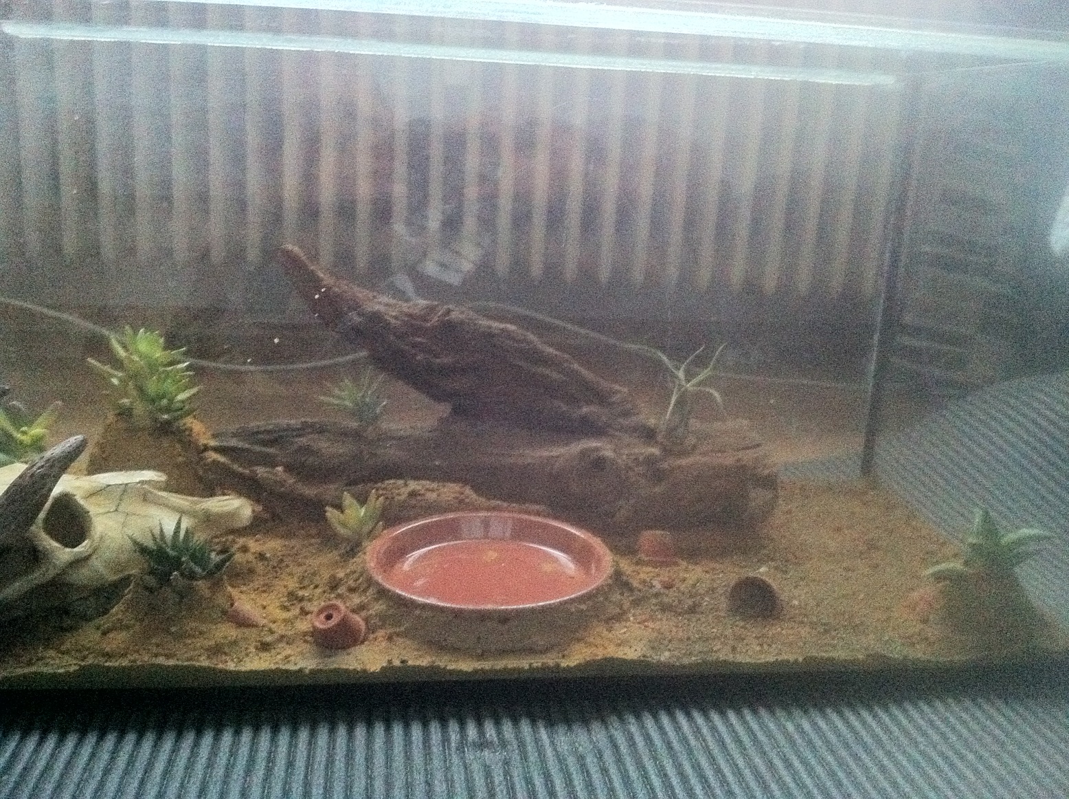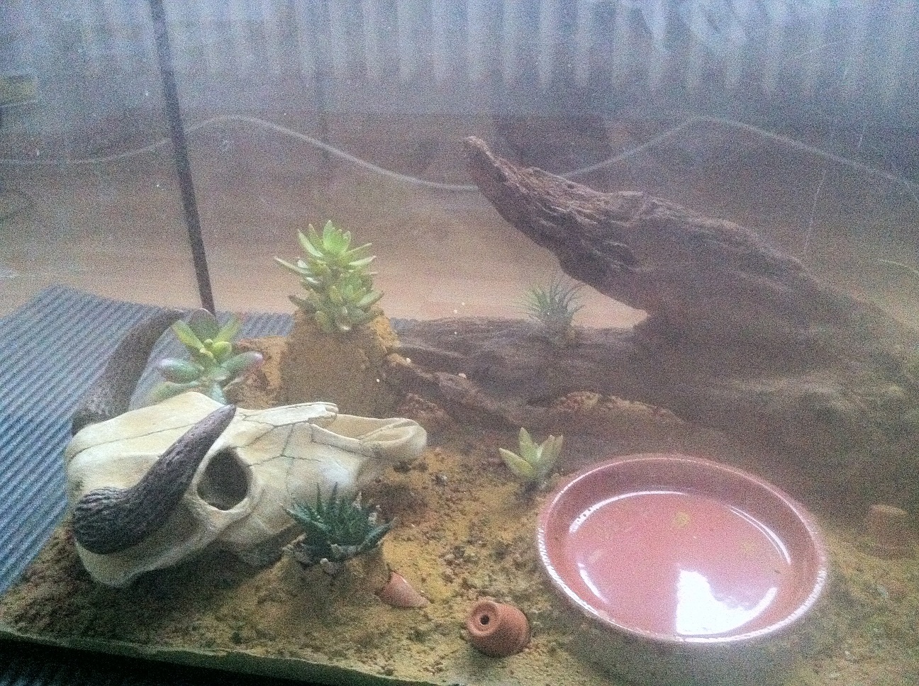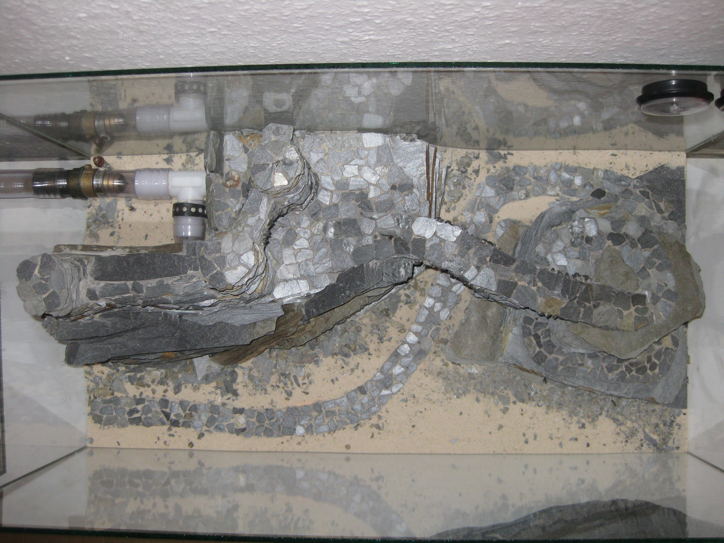 Das ganze Becken hatte ich ursprünglich für Fische zusammengeklebt. Jetzt leicht umfunktioniert für meine neuen Lieblinge :) Der ganze Innenausbau besteht aus einem ganzen Ytongstein. Die Restlücken zum Glas hab ich mit Gips ausgegossen.