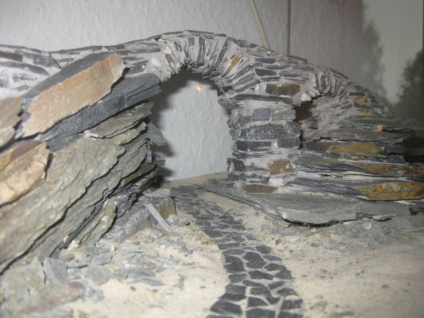 Das große Formicarium ist komplett aus Schiefergestein und Fliesenkleber in Massivbauweise errrichtet. Dies war notwendig, da sich meine Ameisen im Vorgängermodell in den Styroporkern gefressen hatten und sich dort häuslich einrichten wollten.