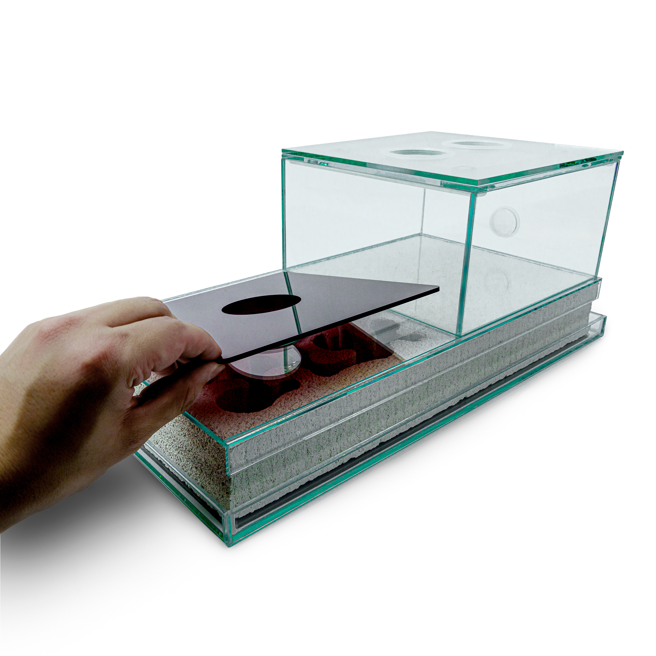 Empfehlung: Wir empfehlen eine Bodengrund-Schicht von 2 mm Höhe, damit die Tiere sich nicht in der Arena eingraben können und stattdessen die dafür vorgesehene Farm nutzen. Außerdem empfehlen wir das Nistmaterial in der Farm (Sand/Lehm, Digfix, etc.) an einer Stelle leicht einzustechen, um den Tieren das Graben zu erleichtern.