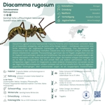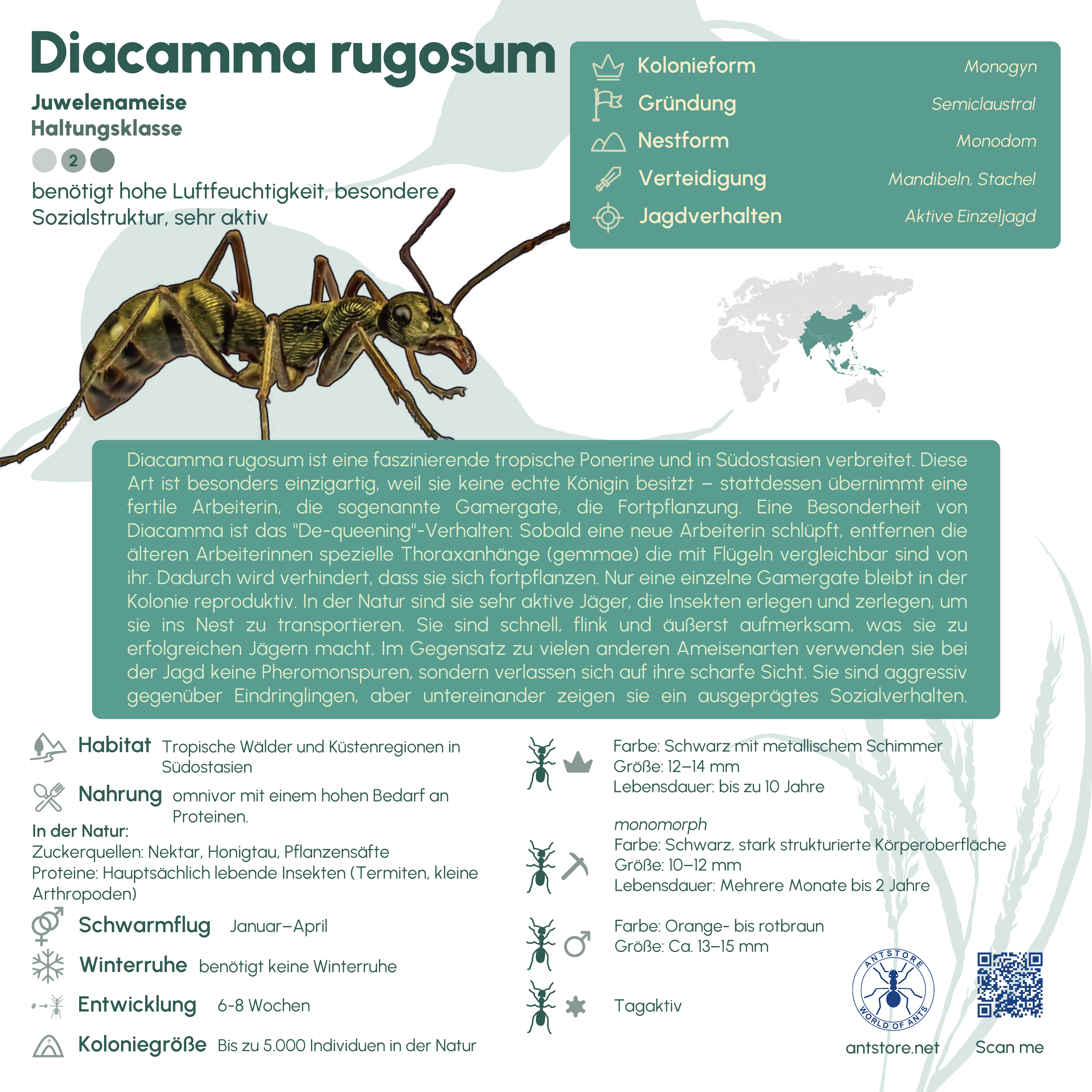 Diacamma rugosum ist eine asiatische Ameisenart welche eine sehr hohe Außenaktivität zeigt. Sie haben einen hohen Proteinbedarf und benötigen ständig Zugang zu tierischem Eiweiß. Insekten werden mit ihrem Stachel betäubt und getötet. Bei größeren Futterquellen sieht man häufig, wie Arbeiterinnen per Tandemlauf zur Futterquelle geführt werden.