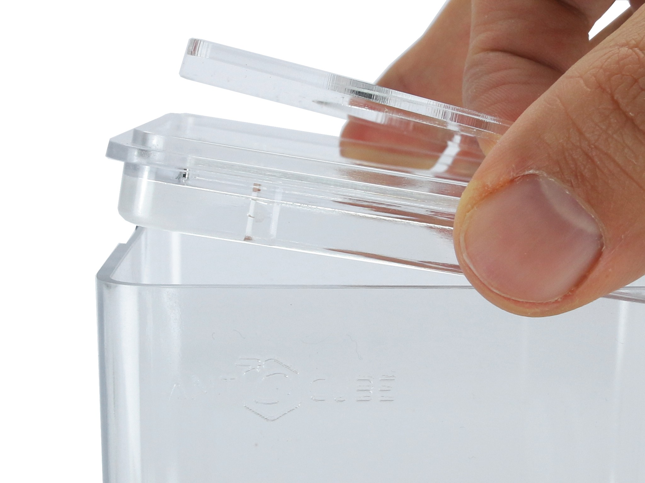 Dieses Behältnis ist mit einem einsteckbaren Rahmen sowie einem Deckel versehen und besitzt zusätzlich zwei 27mm Öffnungen für künftige Erweiterungen. Der Deckel besitzt eine 50mm Bohrung, in die Gittereinsätze, Ventilatoren- oder Lampenfassungen eingesteckt werden können. Diese praktische und pflegeleichte Arena mit integriertem Gipsnest, eignet sich für Gründungskolonien die ihre Nester gerne in der Erde oder zwischen Steinen bauen.