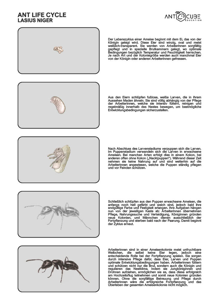 Beschreibung: Dieses Poster gibt einen Überblick über die Entwicklungsstadien von Ameisen, vom Ei bis zur Arbeiterin, am Beispiel der Ameisenart Lasius niger.