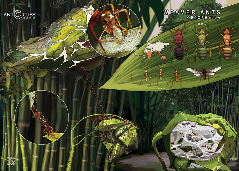 Beschreibung: Dieses Poster gibt einen Überblick über die Lebensweise und den Nestbau von Oecophylla, der Weberameisen Art aus Asien, Afrika und Australien.