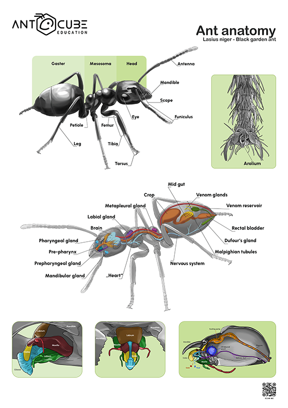 Description: This poster illustrates the anatomy of the black ant (Lasius niger). Detailed illustrations show the most important internal and external body features and organs, making it easy to understand the structure of this widespread ant species. Ideal as teaching material for schools and universities or as a decorative collector's item.