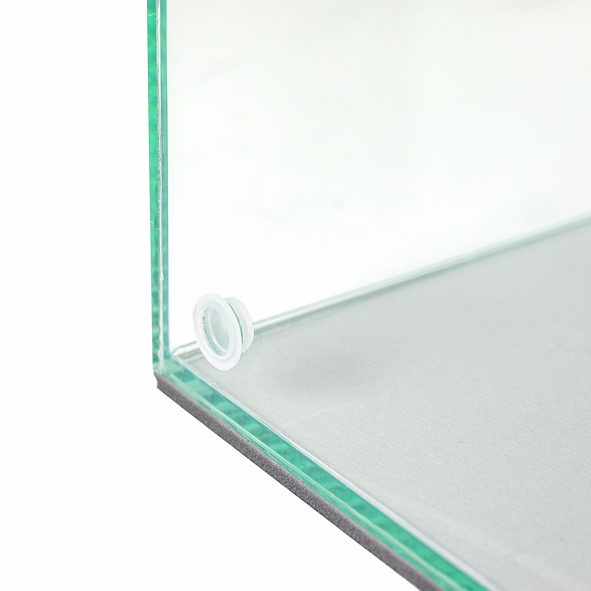 The two 10mm holes on the side, located at 2cm height (center) from the bottom, are for draining excess water. For example, you can use our hose transparent 10/06mm to drain the water. The two 50mm holes can be either closed via the included plugs or serve as additional ventilation when equipped with grid inserts. You could even connect two setups here via an acrylic tube. This way, if you keep animals inside your Vivarium, they can roam freely from one setup to another.