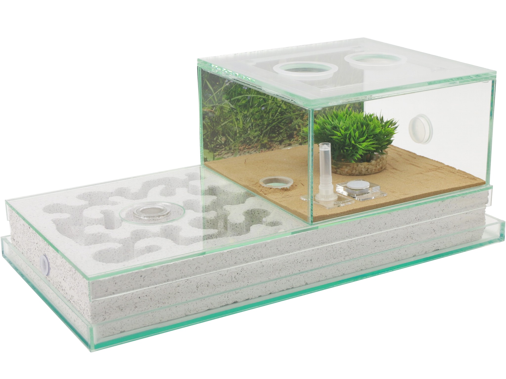 Due to the water-retaining property, the material is well suited for keeping ants. It is possible to keep a large number of burrowing species in it, both from dry and wet habitats. Depending on the ant species, it is recommended to cover the bottom of the chambers with soil substrate. Some species feel more comfortable this way and for example Ponerinae species need soil for their larvae to pupate properly. Since this nest already includes an arena, it can be used as a complete formicarium setup.