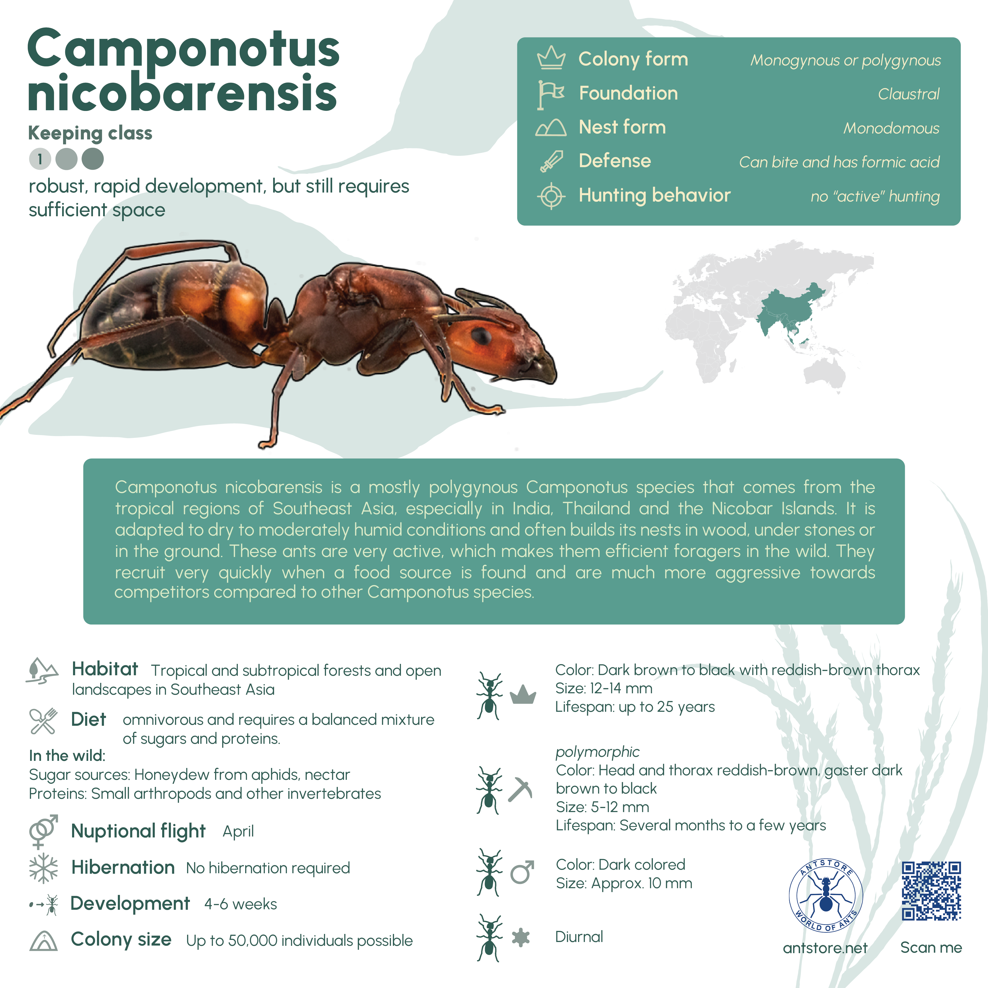 Camponotus nicobarensis is an active but mostly nocturnal ant. They show a fast brood development and high range towards climate conditions.