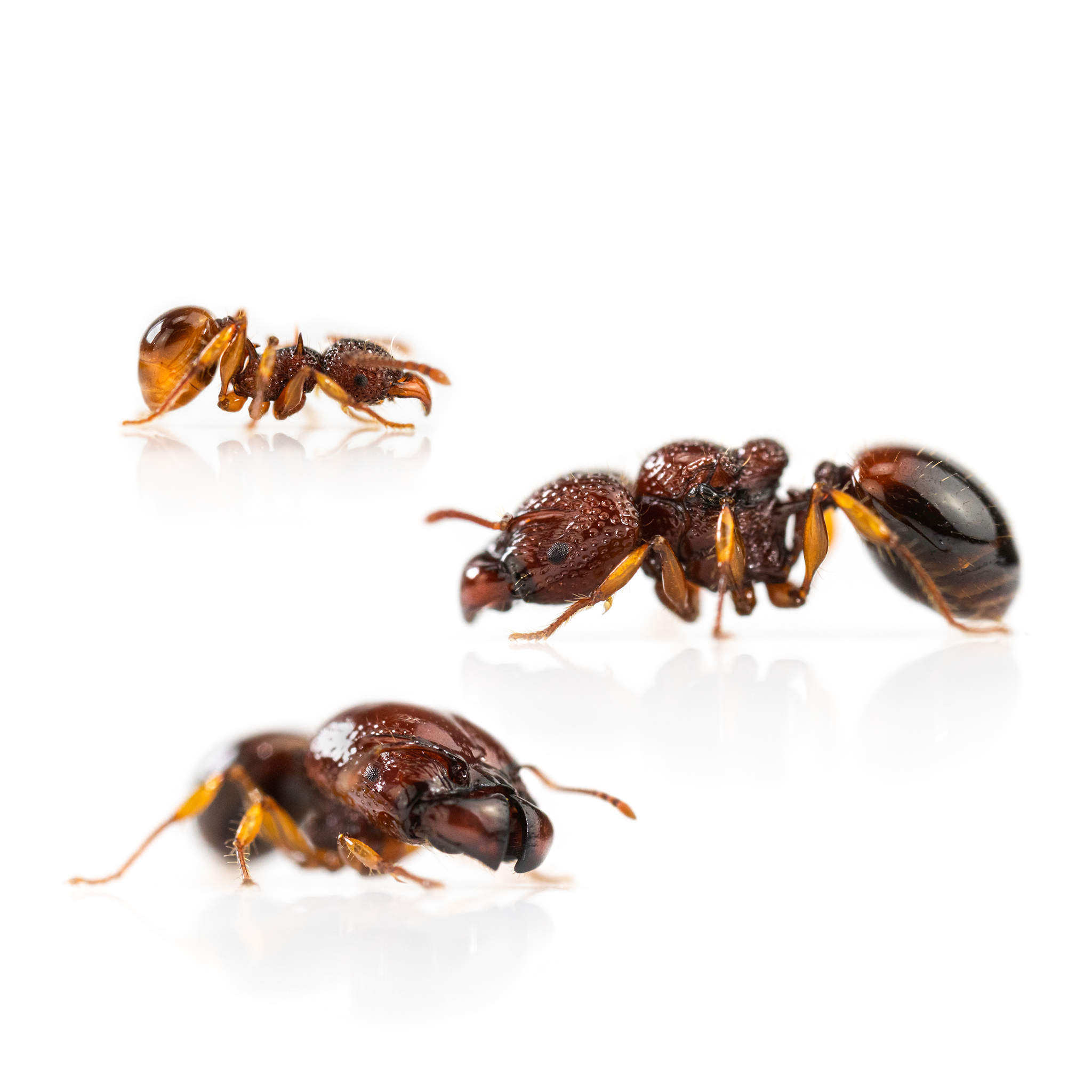 Very small and special species from Thailand. Acanthomyrmex thailandensis feeds in nature mainly on fig seeds. It forms a few majors per colony with particularly large heads, which are able to crack the fig seeds with their powerful mandibles.
